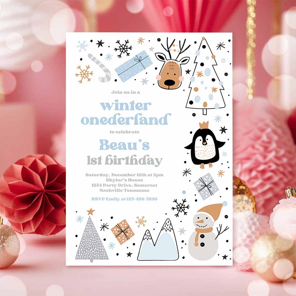 Winter Onederland Invitation Whimsical Winter Forest Mountains Animals Blue Silver Winter ONEderland Birthday