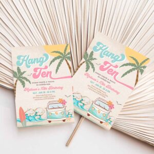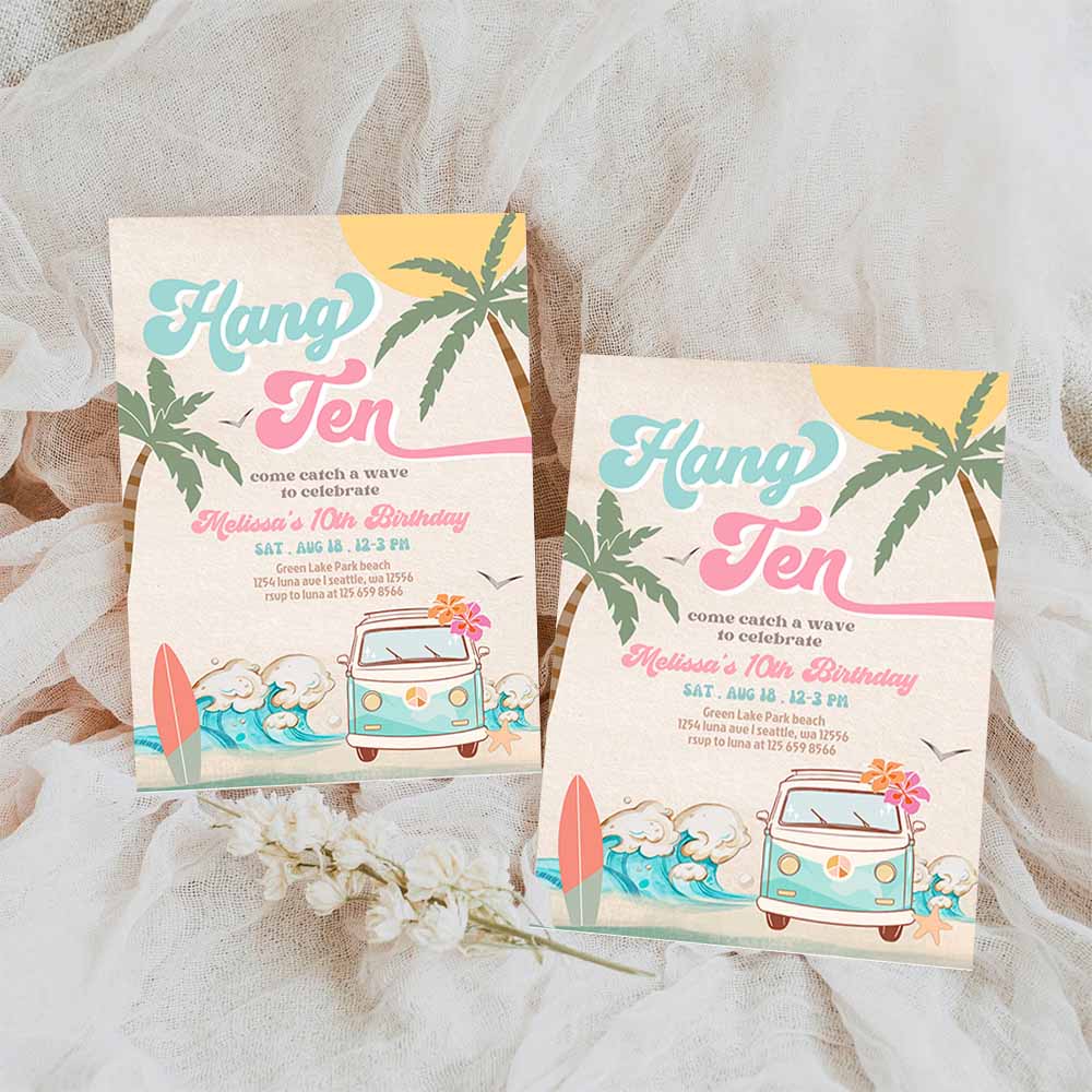 10th Pink Mint Girl 10th Surfing Birthday Invitation, Girl Surf Van Surfboard Beach Party Invitation