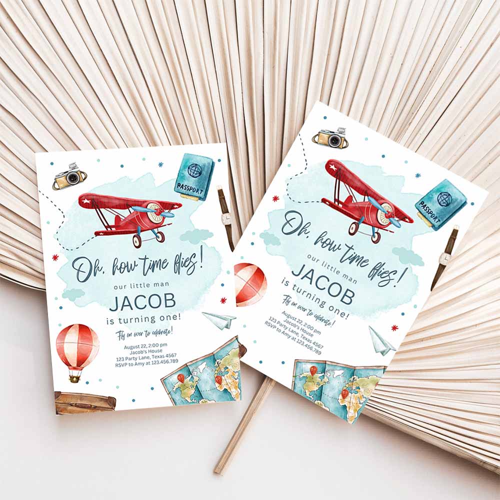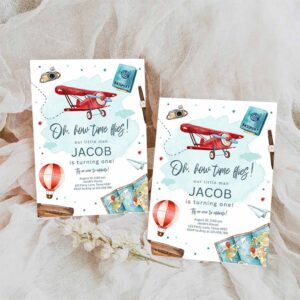 Airplane Birthday Invitation, Oh My Time Flies Red Airplane First Birthday Travel