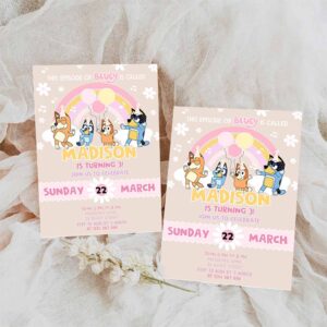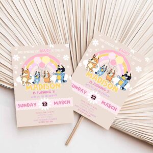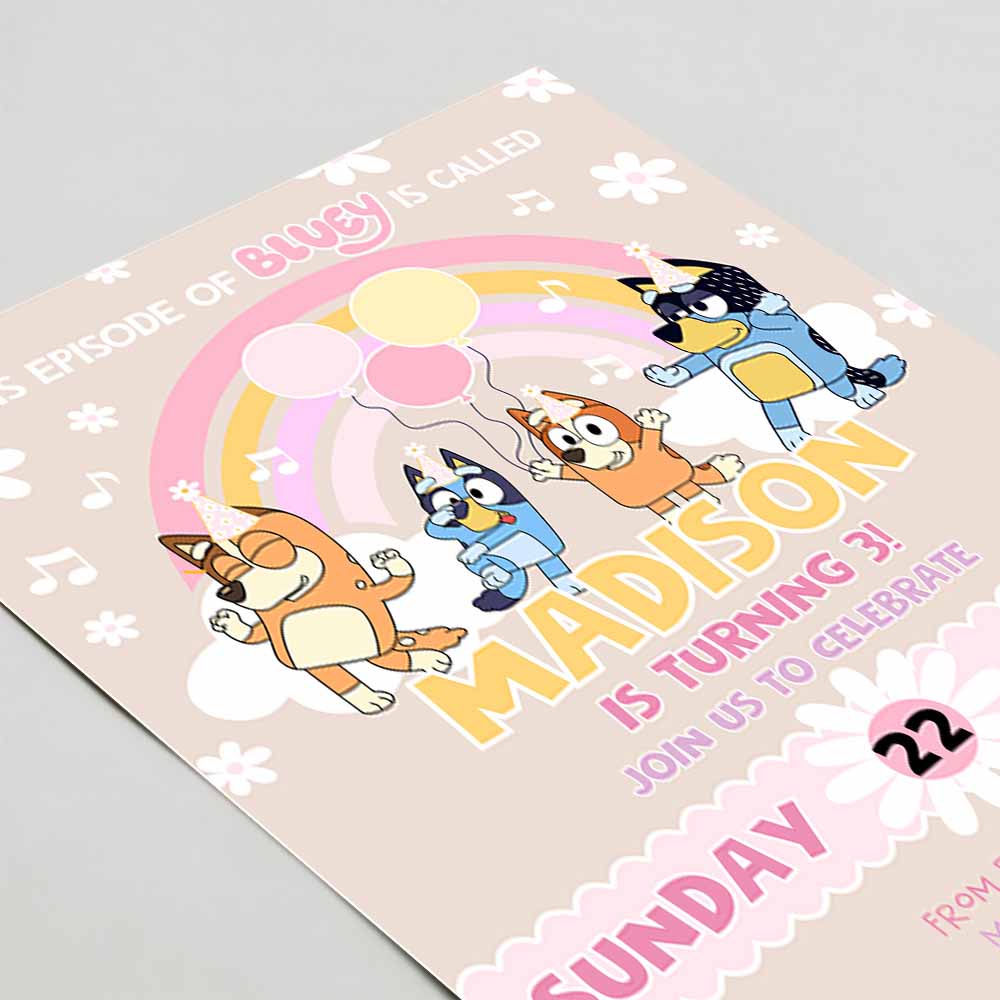 Baby Bluey Party Invites, Bluey Pink Yellow Blue Girl 3rd Party Birthday Invitation, Bluey Party Invitation