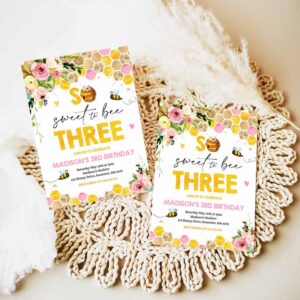 Bee Kids Birthday Invitation, Honey Bee Kids Birthday, Pink Yellow Floral Bumble Bee Party, So Sweet To Beeree Party