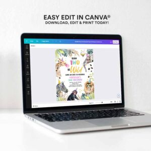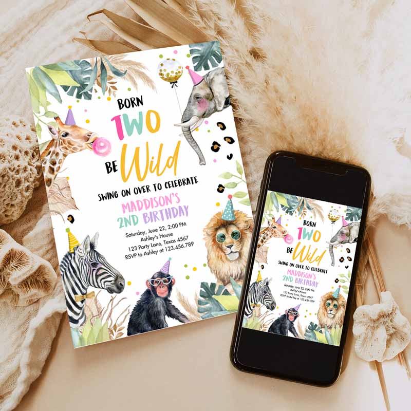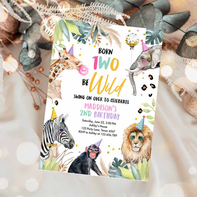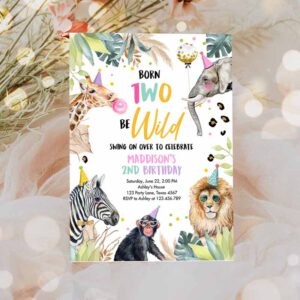 Kids Birthday Invitation, Girl Born Two Be Wild Animals Invite Safari Zoo Kids Birthday