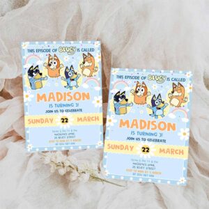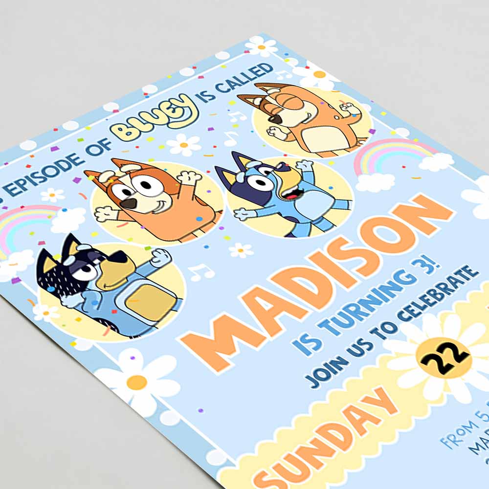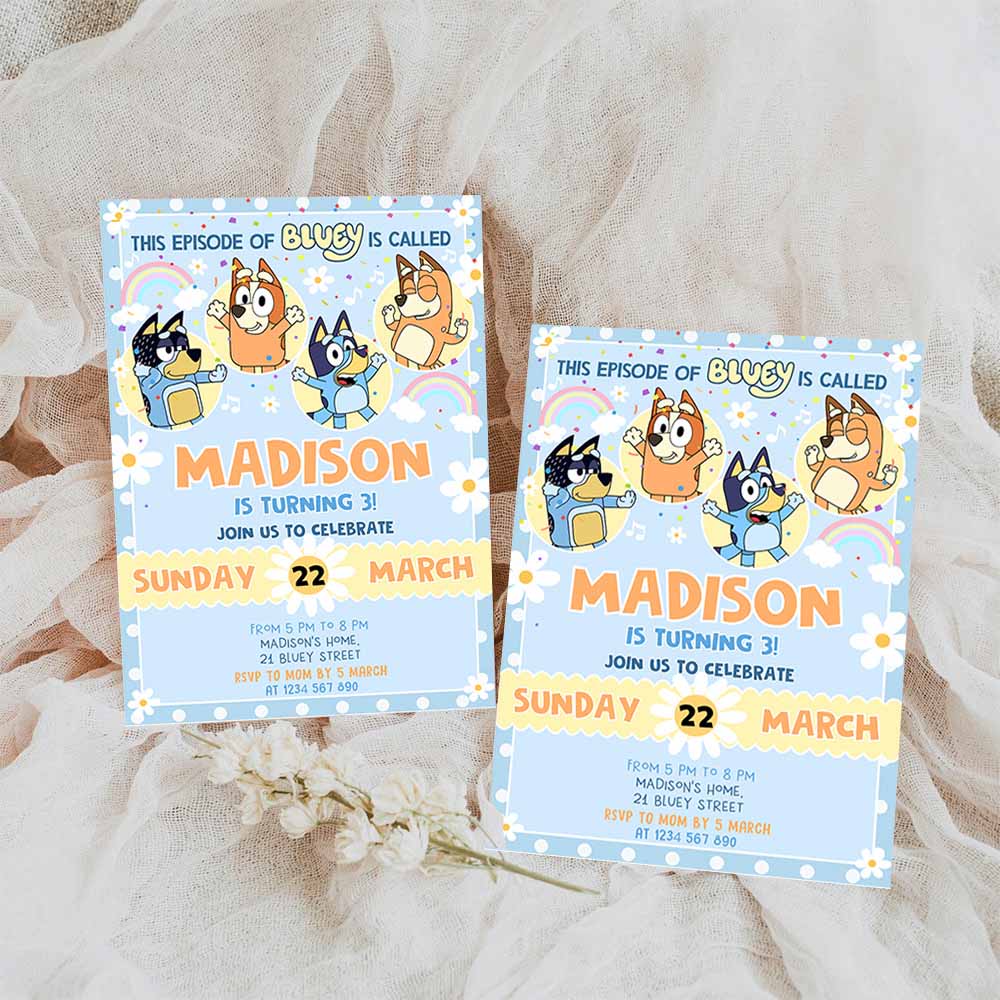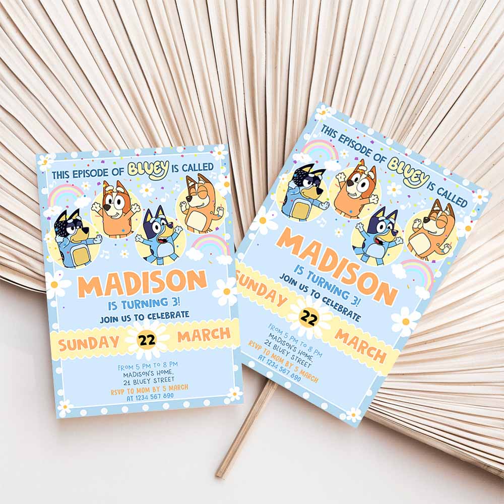Bluey Birthday Invitation, Cartoon Bluey Pink Yellow Girl 3rd Party Birthday Invitation, Bluey Party Invitation