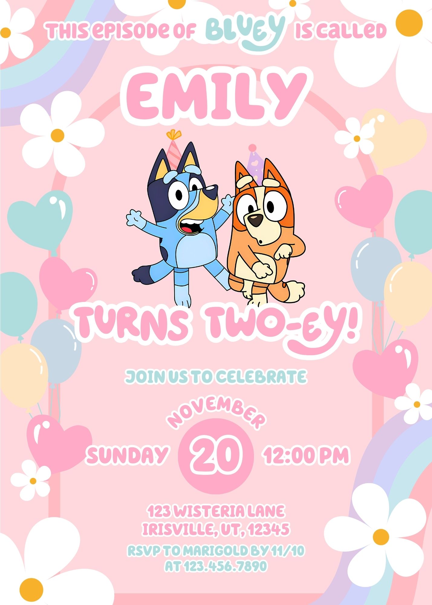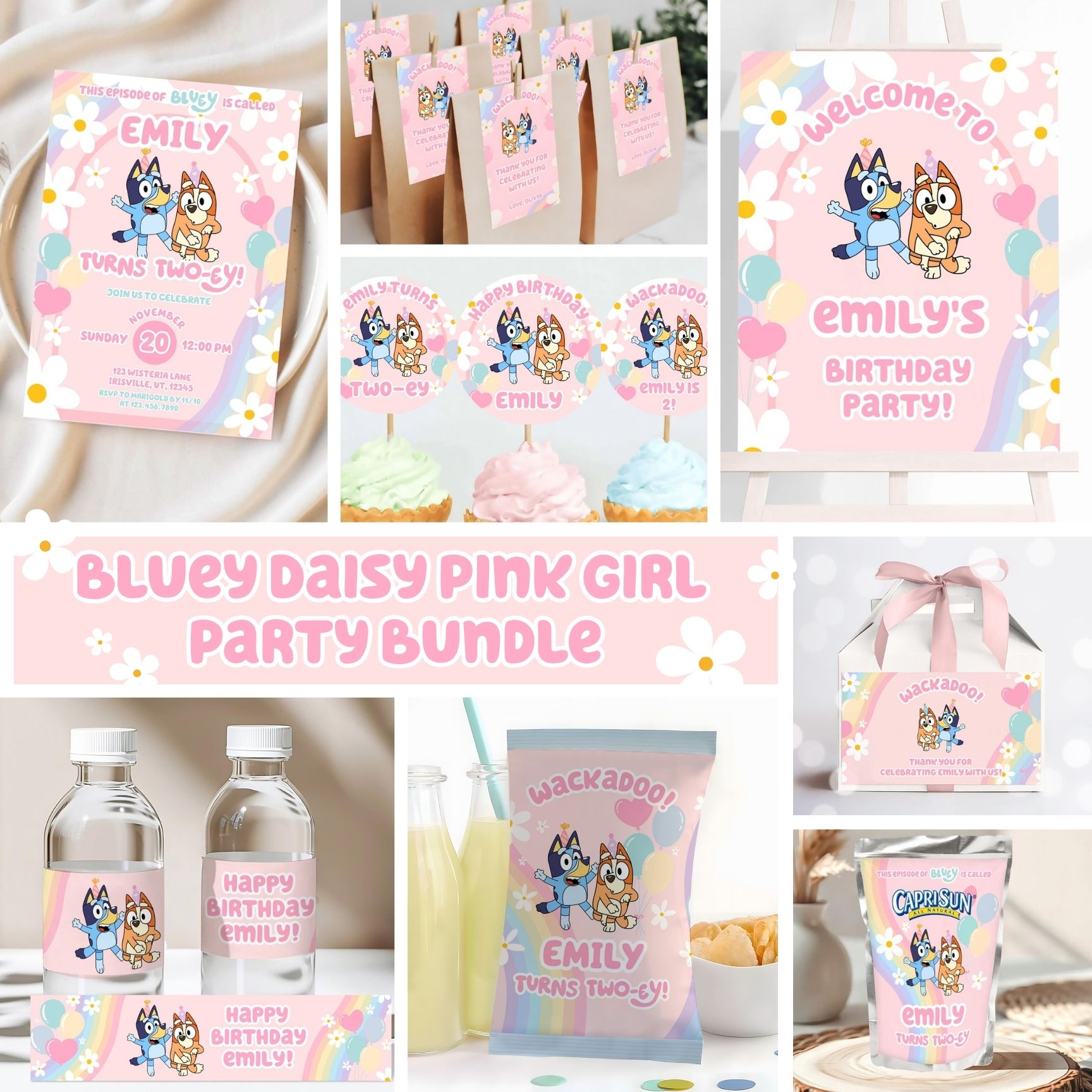 Bluey Daisy Pink Girl Party Bundle, Bluey Birthday Invitation