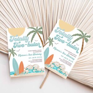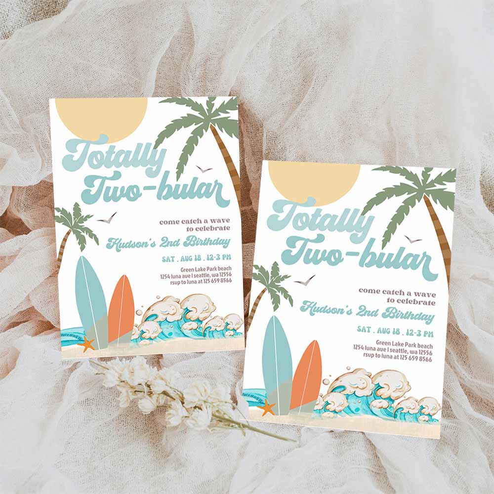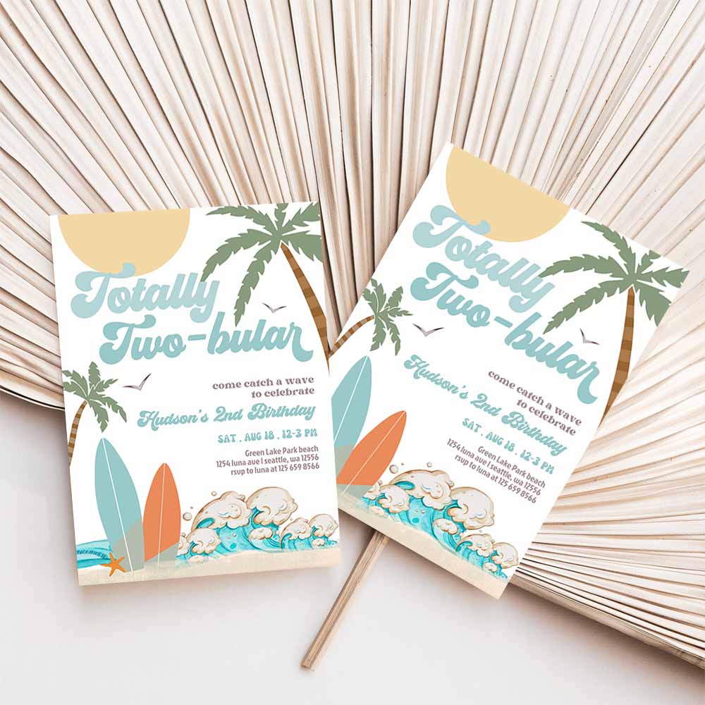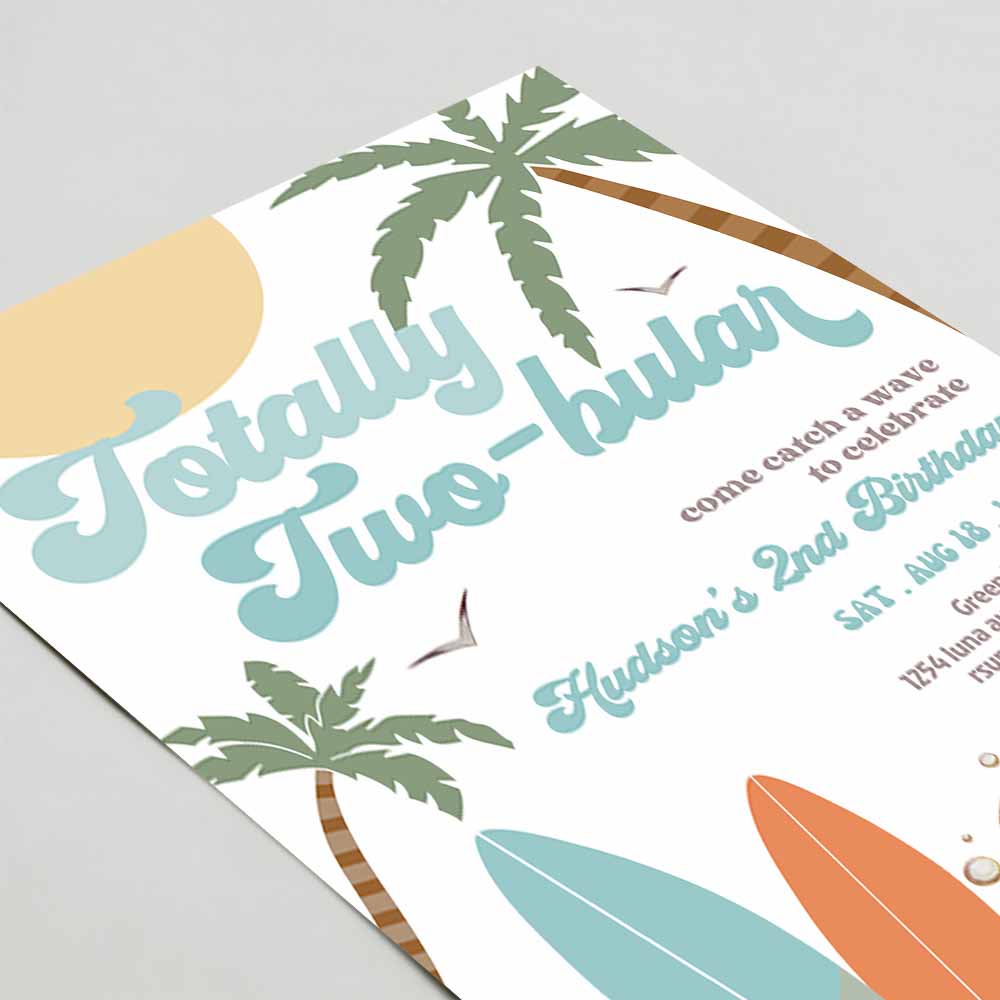 Boy Surf Surfing 2nd Birthday Totally Two-bular Modern Minimal Surfboard Beach Party Invitation