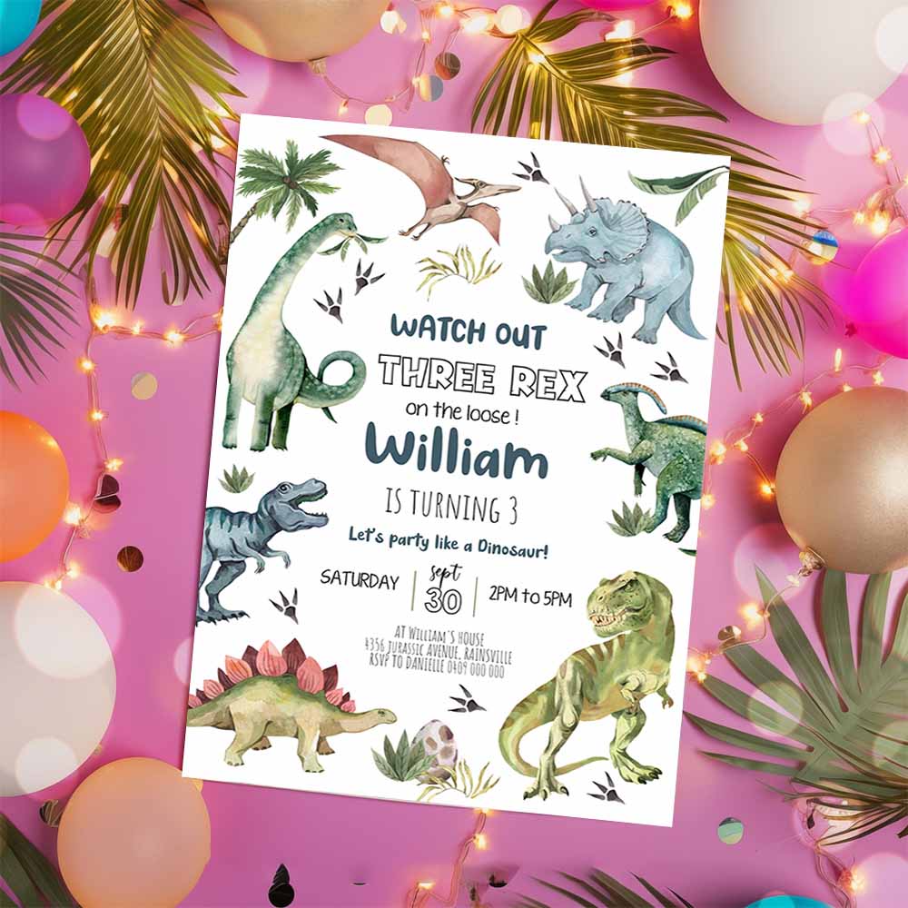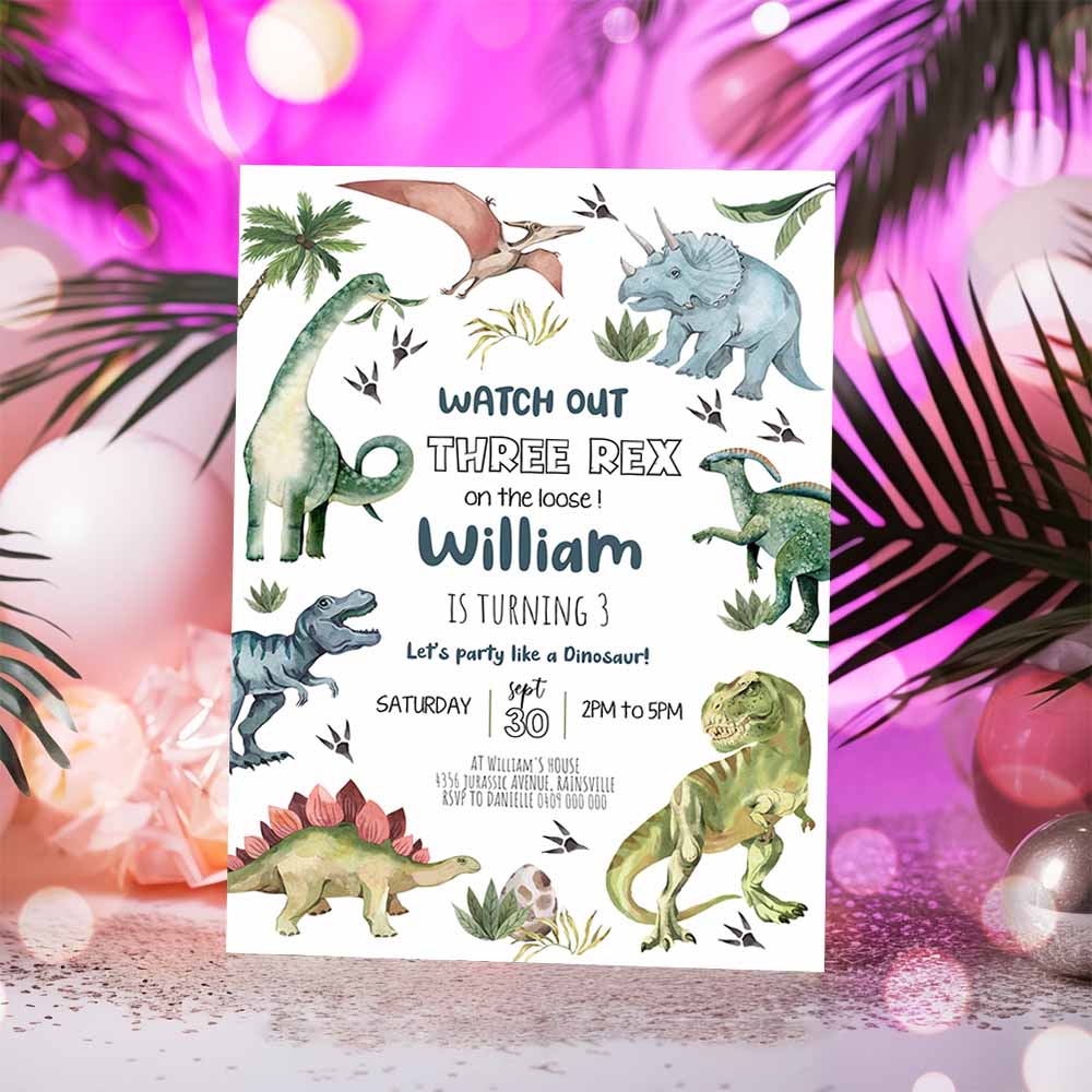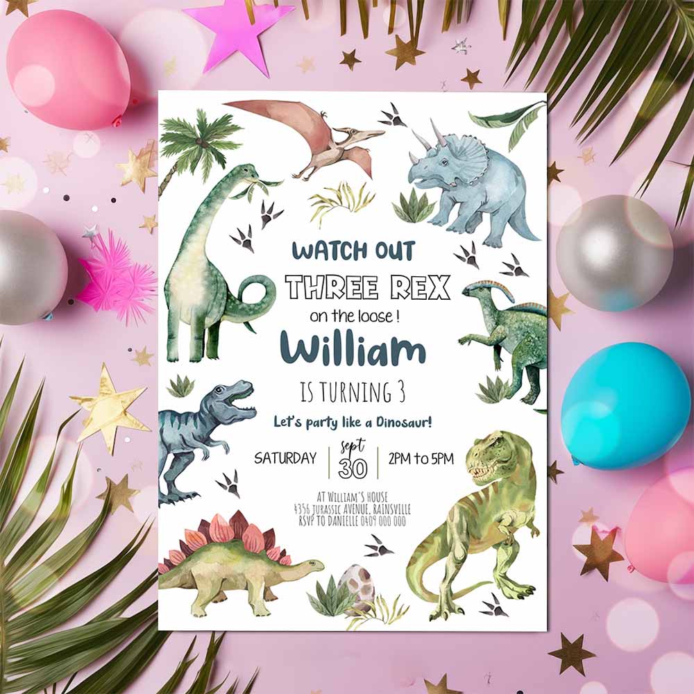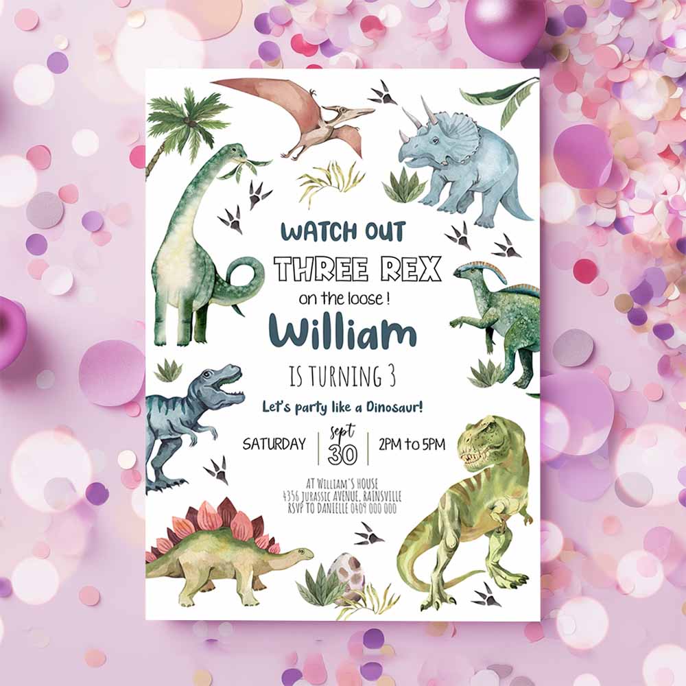 DINOSAUR BIRTHDAY Invitation, Girl Three Rex Party Invitation, Digital Dinosaur Invitation