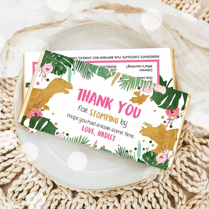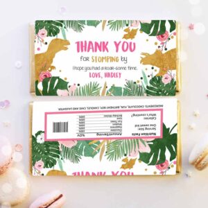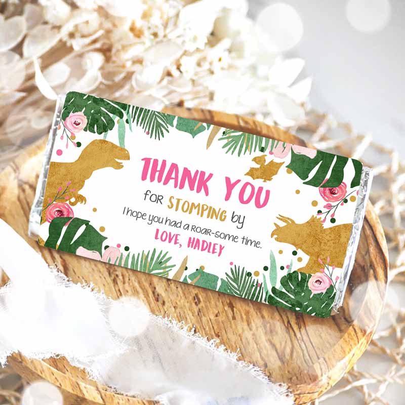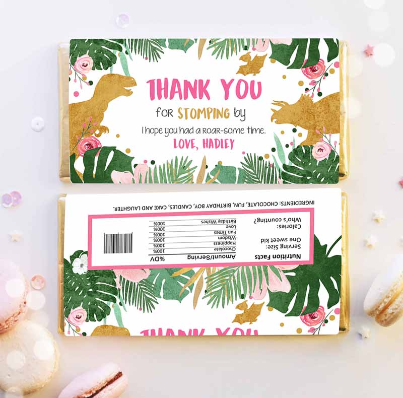 Dinosaur Chocolate Bar Labels, Candy Bar Wrapper Safari Tropical Gold Pink Girl Kids Birthday