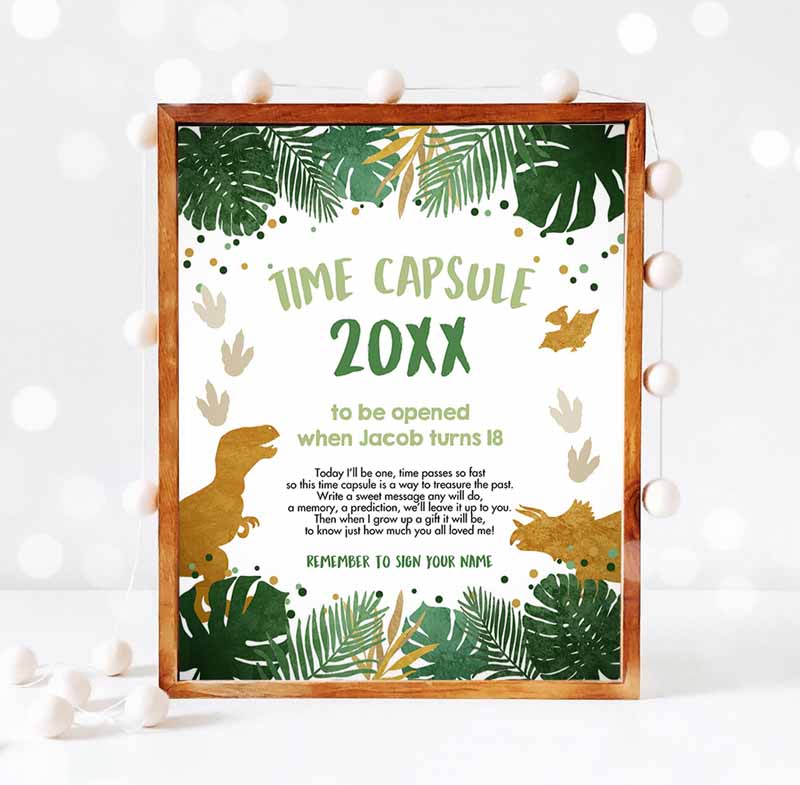 Dinosaur Time Capsule First Kids Birthday Party, Green Gold Boy Party, Cards T-Rex Guestbook