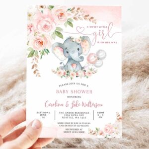 Blush Pink Rose Gold Elephant Baby Shower Invitation, Girl Baby Elephant