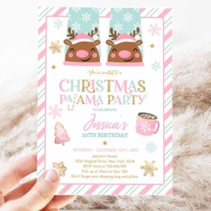 Christmas Pajama Kids Birthday, Girly Pink Gold Slumber Party Invitation, Holiday Pajama Party Invitation