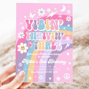 Vibin’rivin’ and Three Kids Birthday Invitation, Pink Purple Blue Groovy Rainbow Party