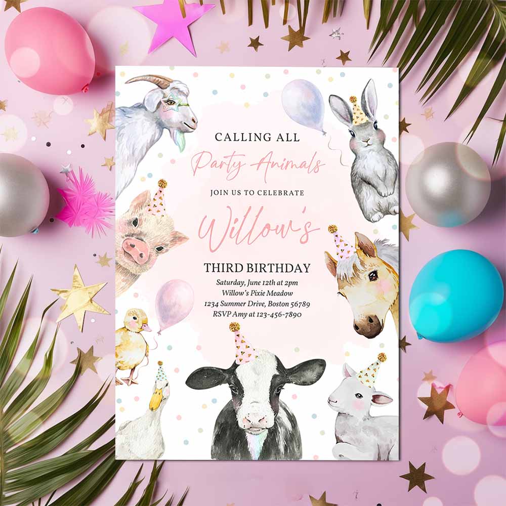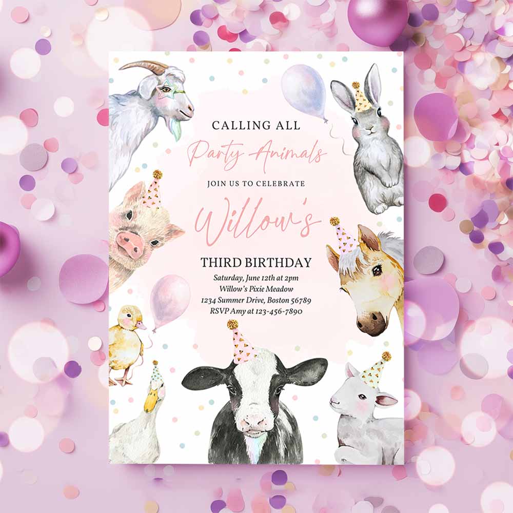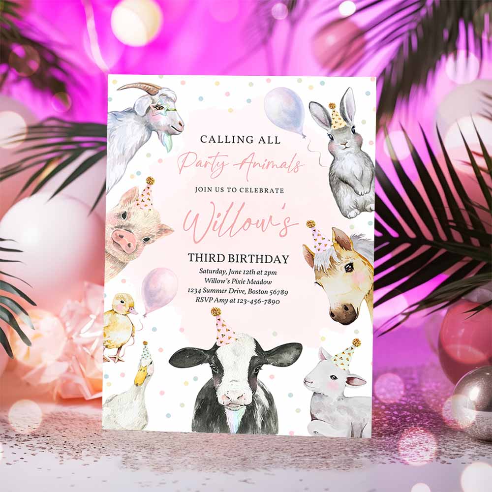 Farm Animals Birthday Party Invitation, Pink Girl Farm Barnyard 1st Birthday Party Animals 1st Birthday Party