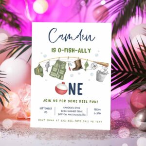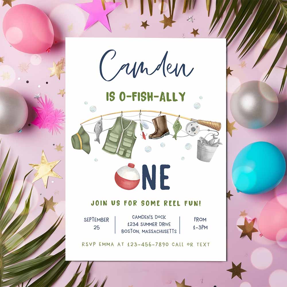 Fishing 1st Birthday Party Invitation, O-Fish-Ally One Boy 1st Birthday Fisherman Party Gone Fishing Party