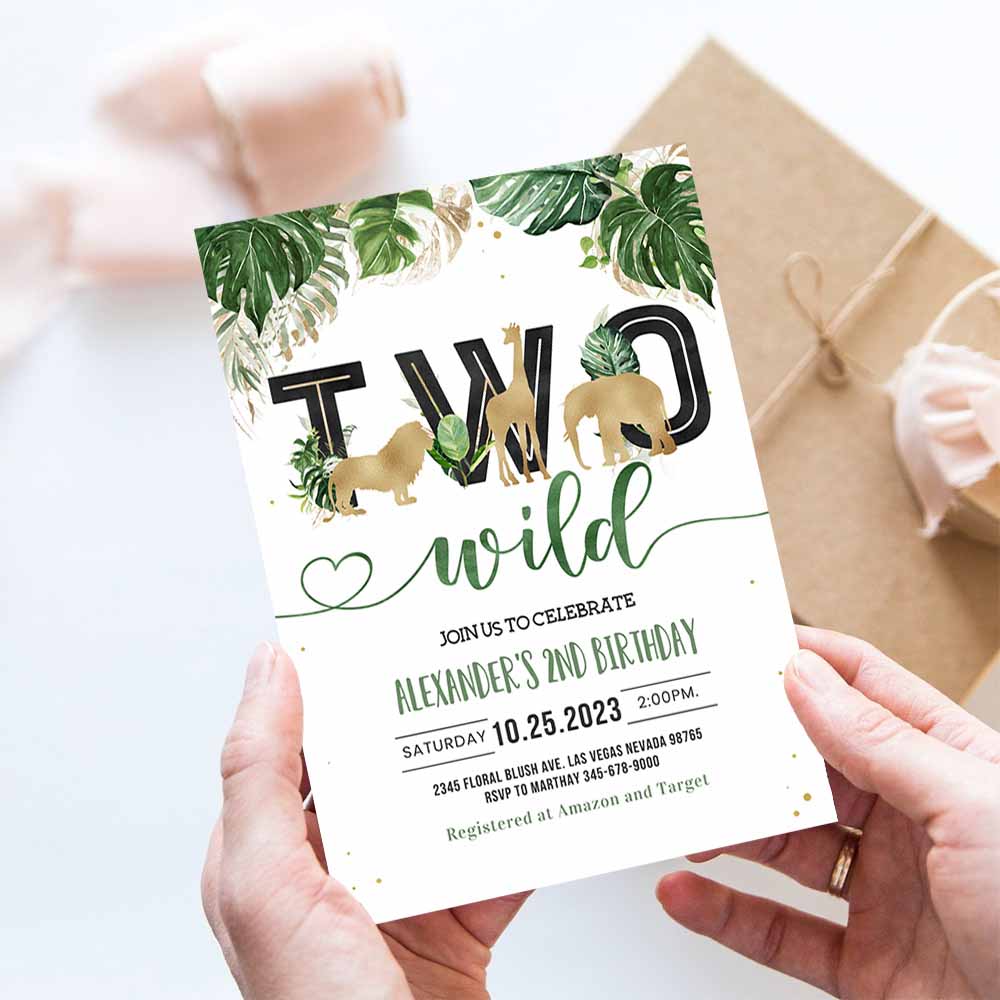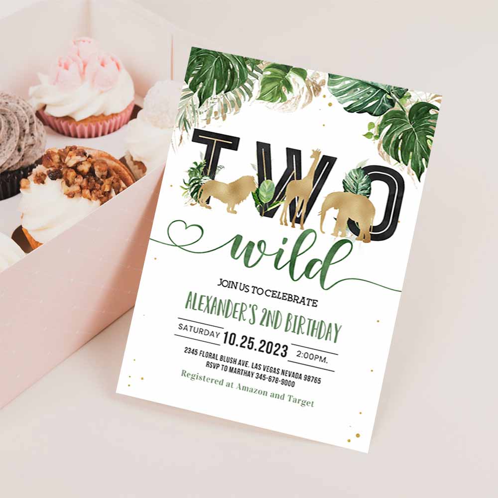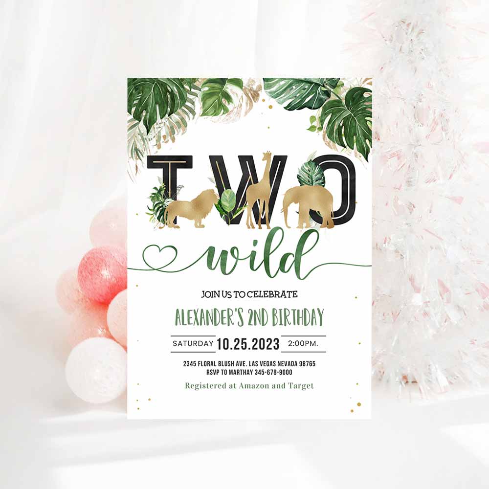 Jungle gold Birthday Invitation, Two Wild Birthday Invite, Safari Animals invitation