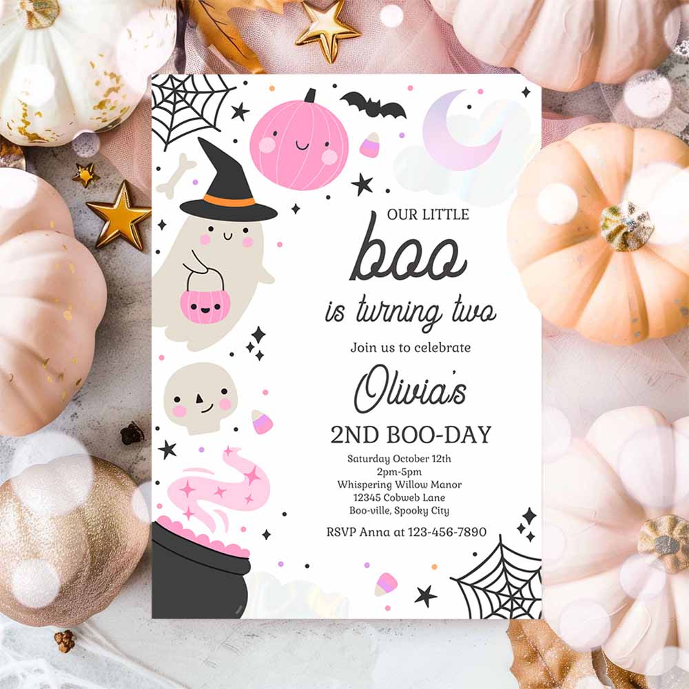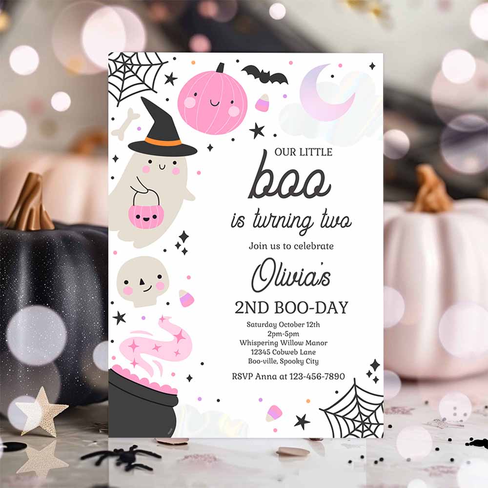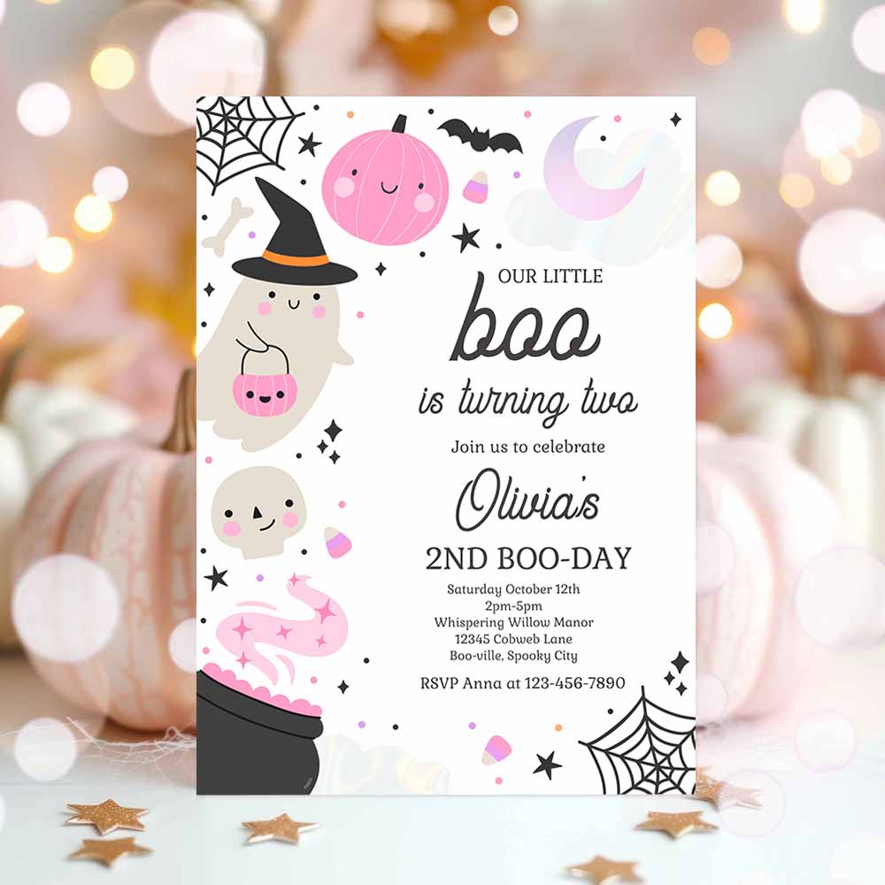 Little Boo Halloween Ghost 2nd Birthday Party Invitation Boho Groovy Ghost Halloween Birthday Party Invite