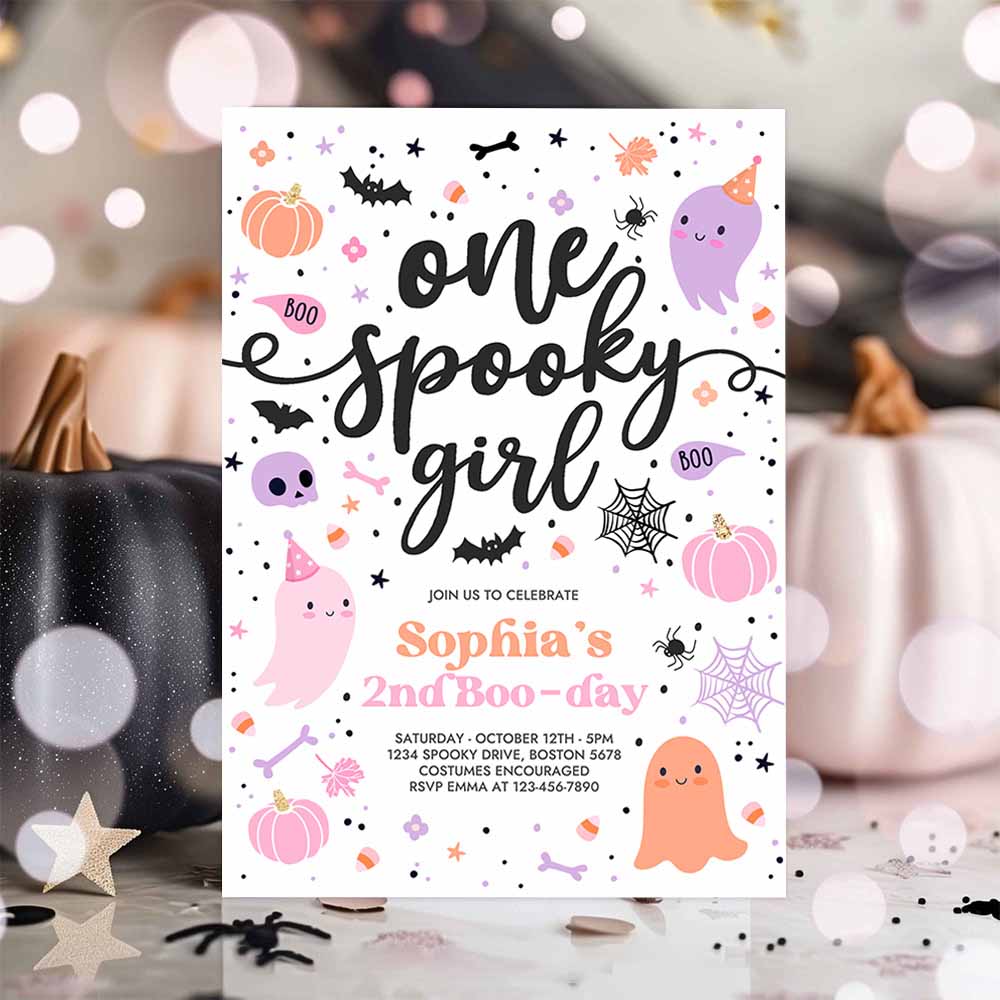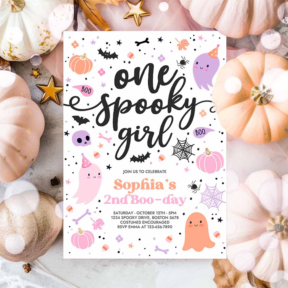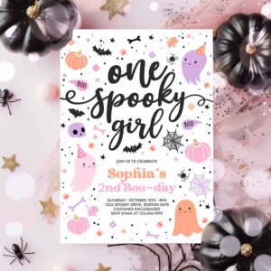 One Spooky Girl Cute Pink Ghost 1st Birthday Party Invitation Cute Pink Ghost 1st Birthday Spooktacular Party