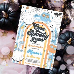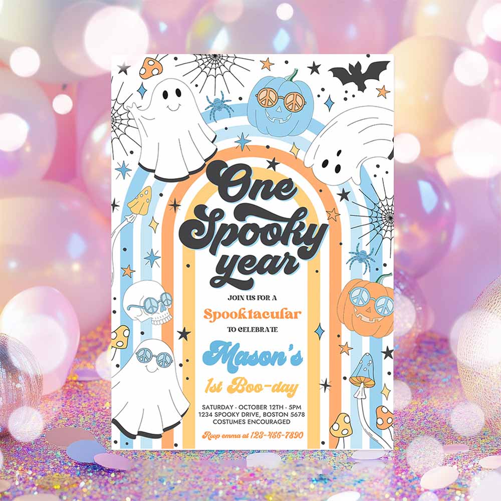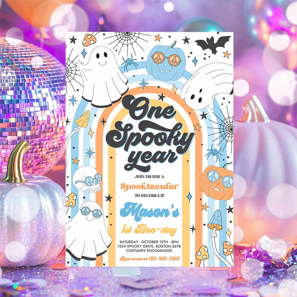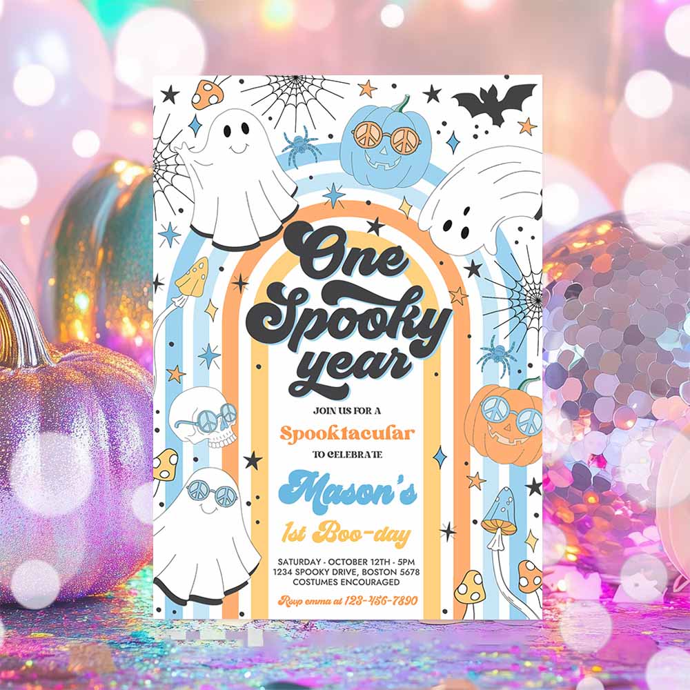 One Spooky Year Halloween Ghost 1st Birthday Invitation Retro Groovy Rainbow Ghost Birthday Hippie Halloween