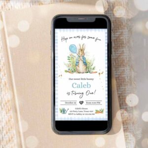 Peter Rabbit Kids Birthday, EvIt’s Electronic Boy Blue Rustic Peter Rabbit First Kids Birthday Invitation, Hop On Over Phone