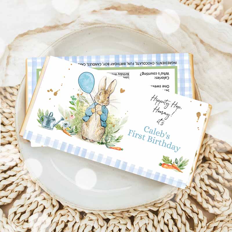 Peter Rabbit Chocolate Bar Labels, Candy Bar Wrapper Bunny Rabbit Kids Birthday, Boy Blue Rustic