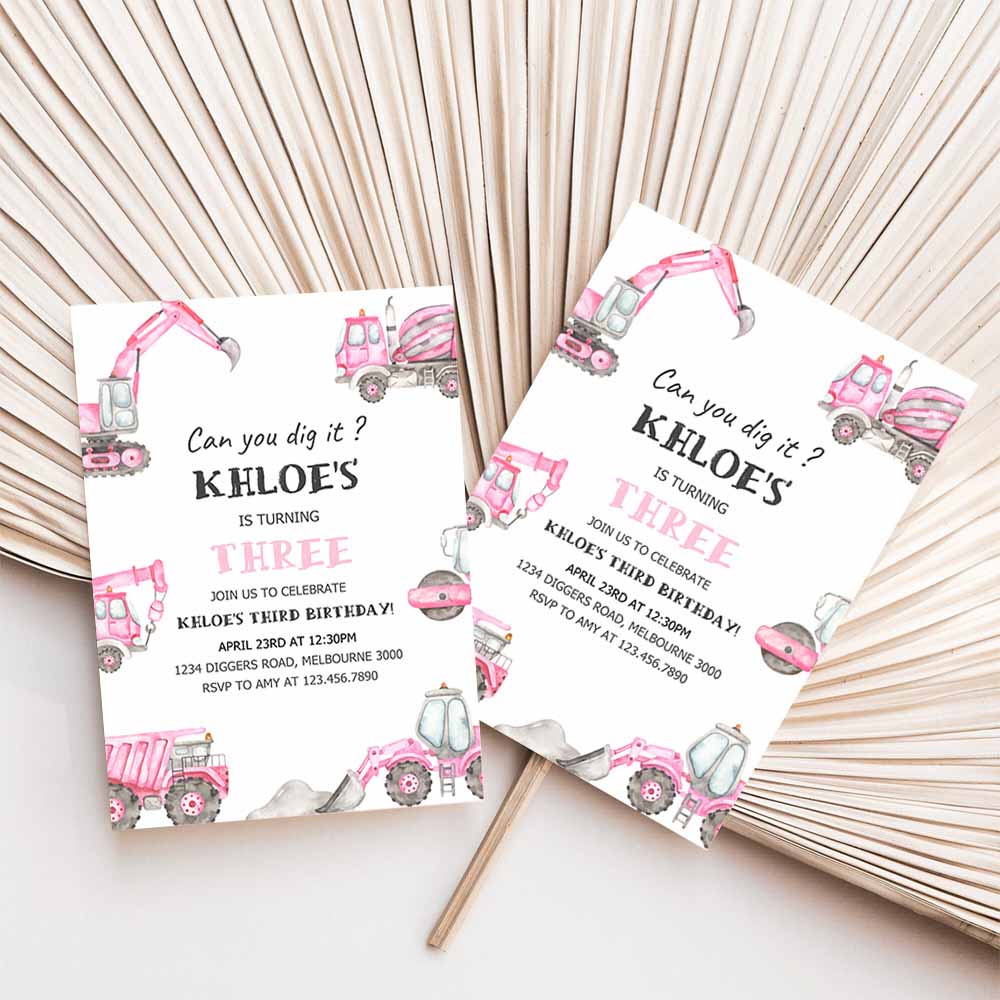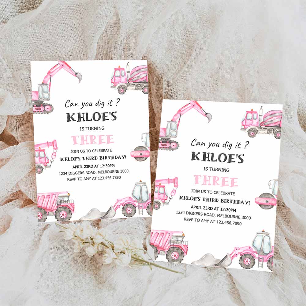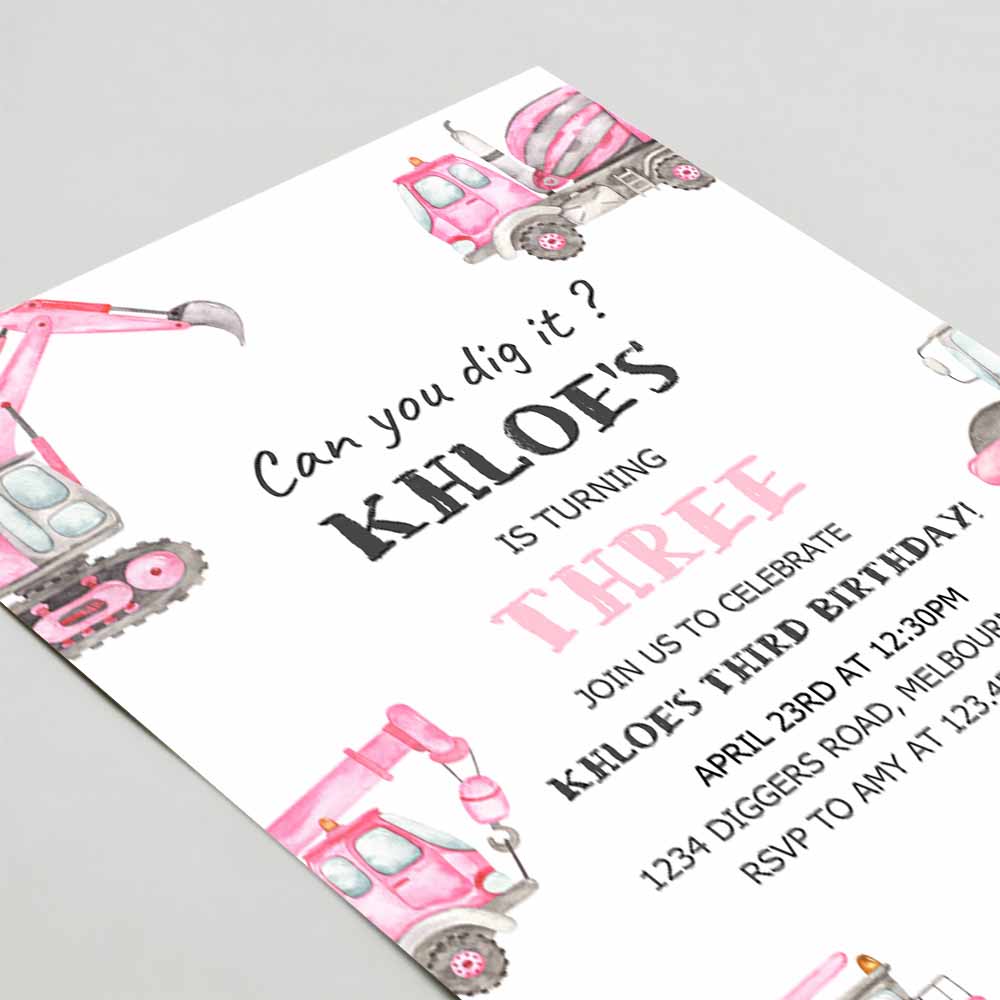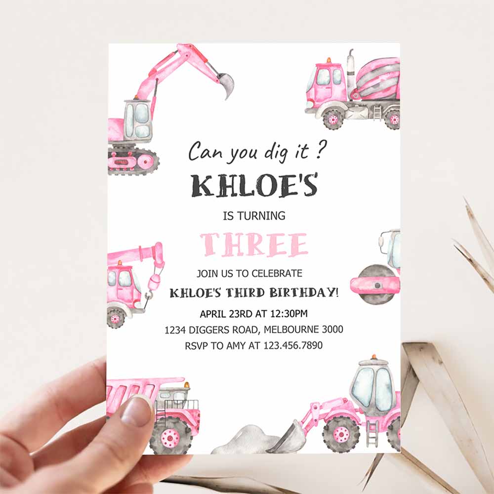 Pink Construction Birthday Invitation, Editable Girl Construction Trucks 3rd B’day Invite, Any Age Pink Digger Truck Party