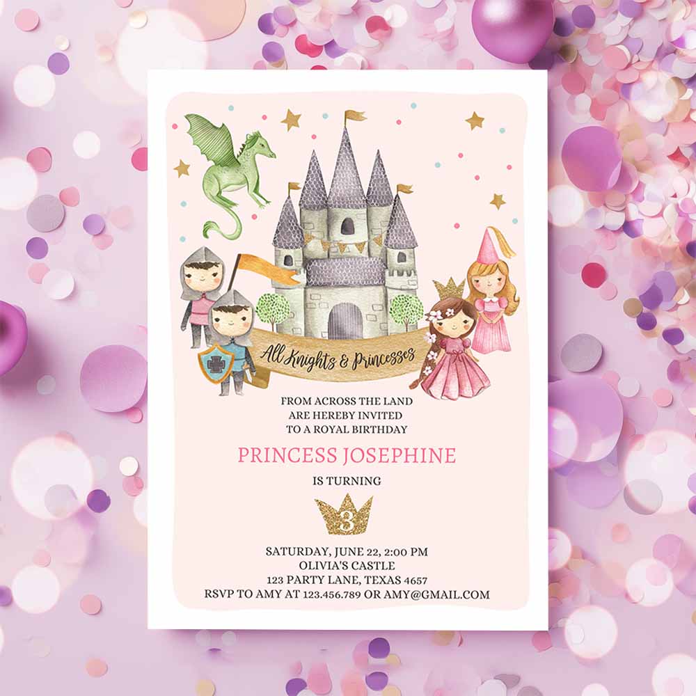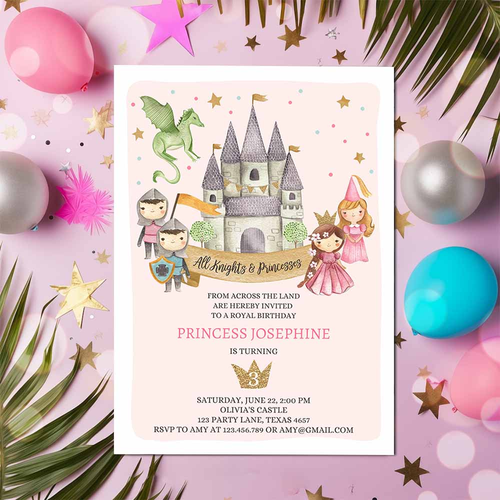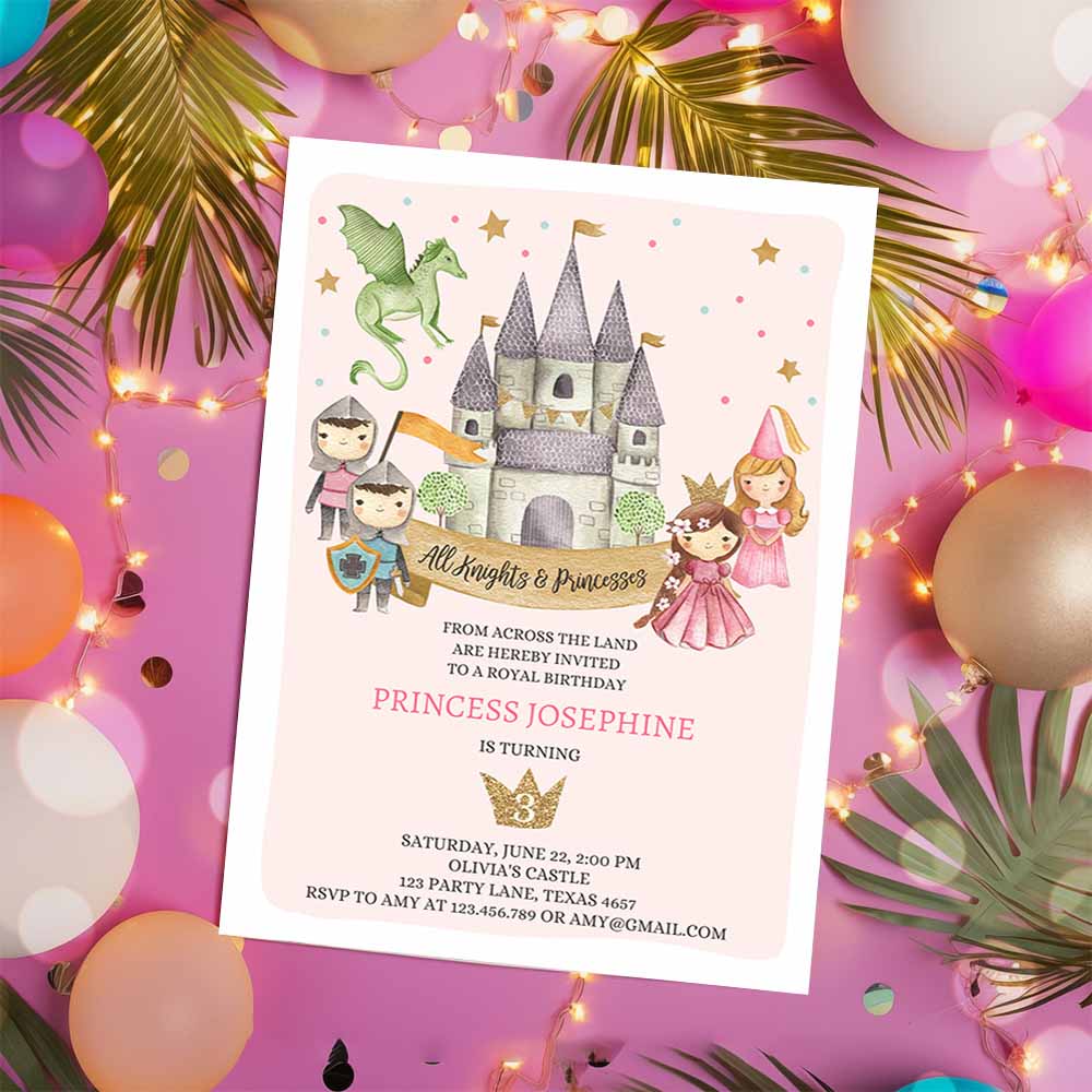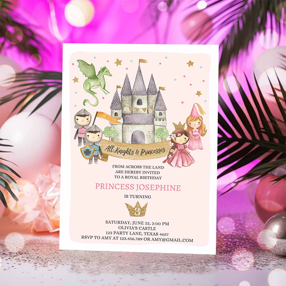 Princess and Knight Birthday Invitation, Once Upon a Time Princess Royal Birthday Girl Pink Castle