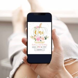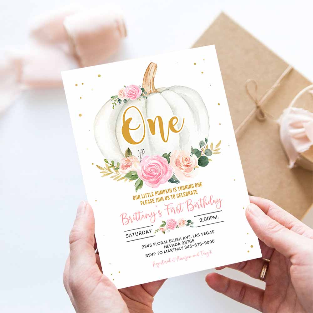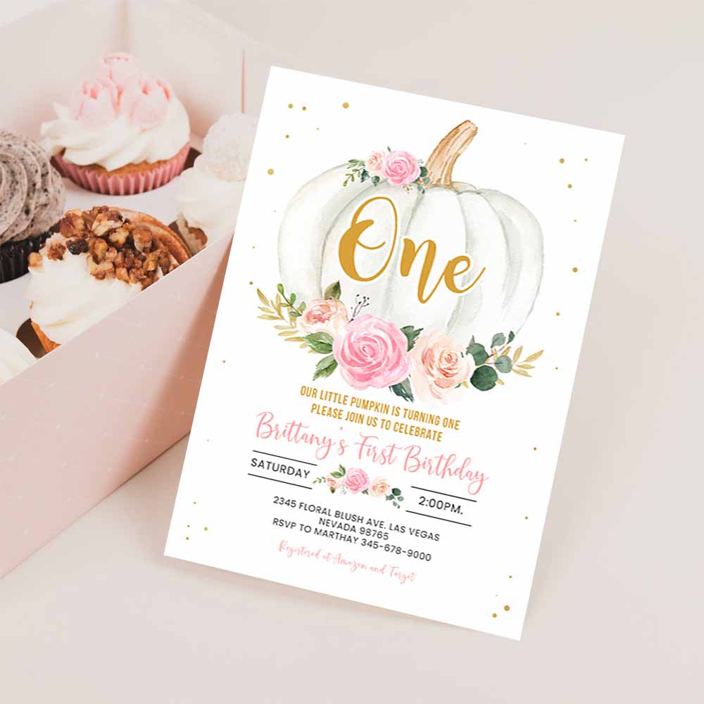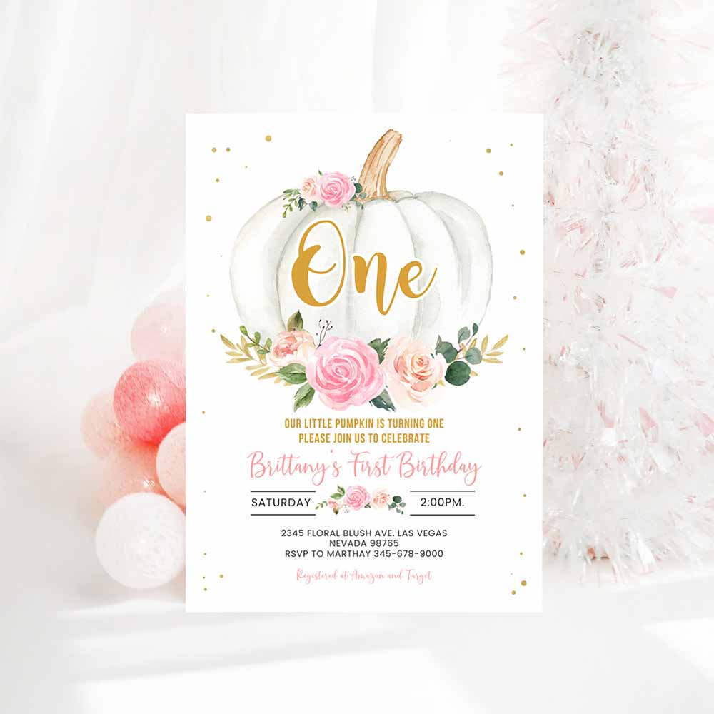 Pumpkin Birthday Invitation, First Birthday Floral Pink and gold Girl White Pumpkin, 1st Fall Autumn