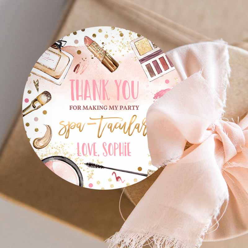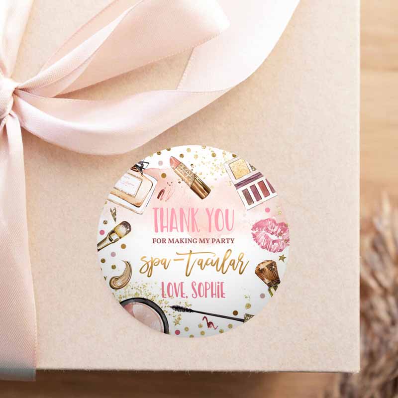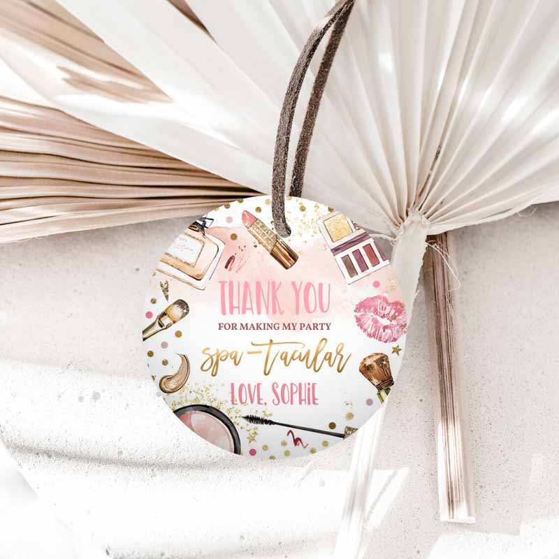 Spa Makeup Party, Circle Square Favour Tag Glitz & Glam Kids Birthday Party, Blush Pink Gold Girly Glamour Party