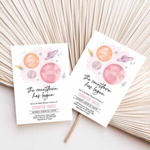 Space Baby Shower Invitation, Galaxy Outer Space Orange Girl Pink Planets Moon Countdown