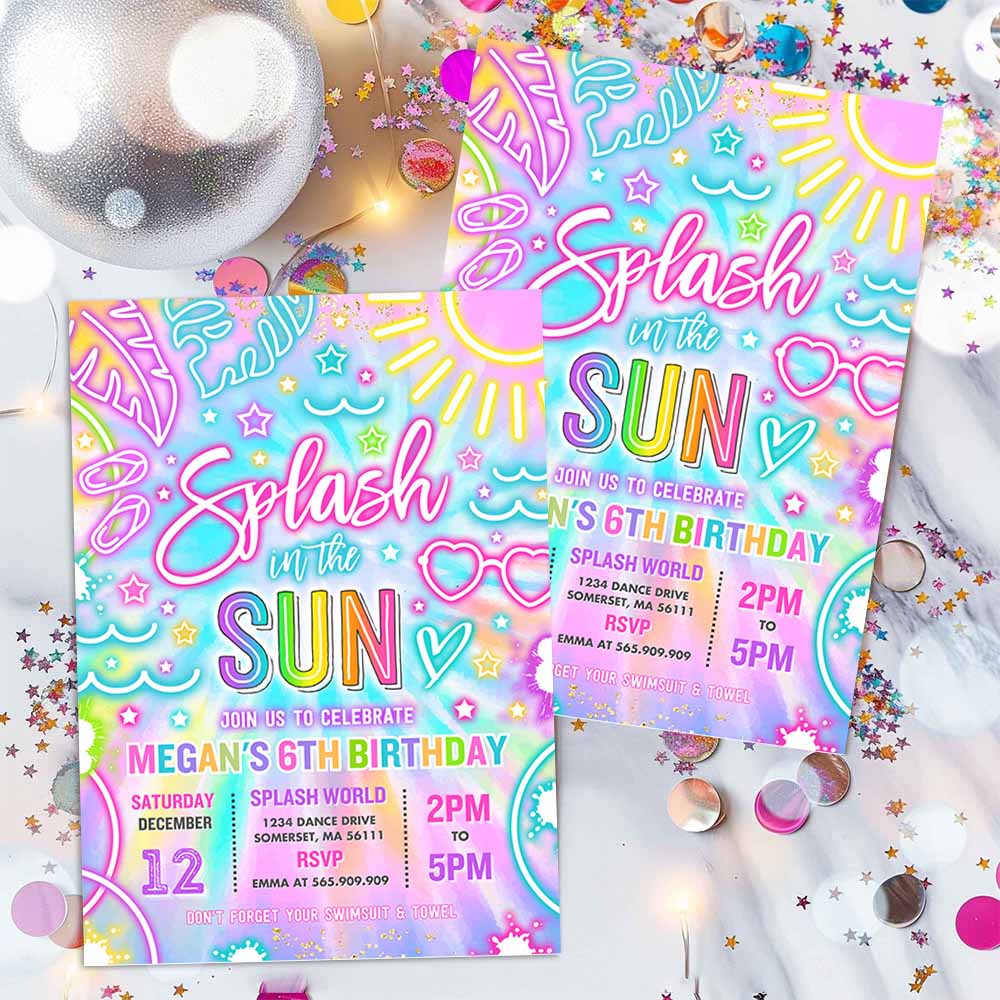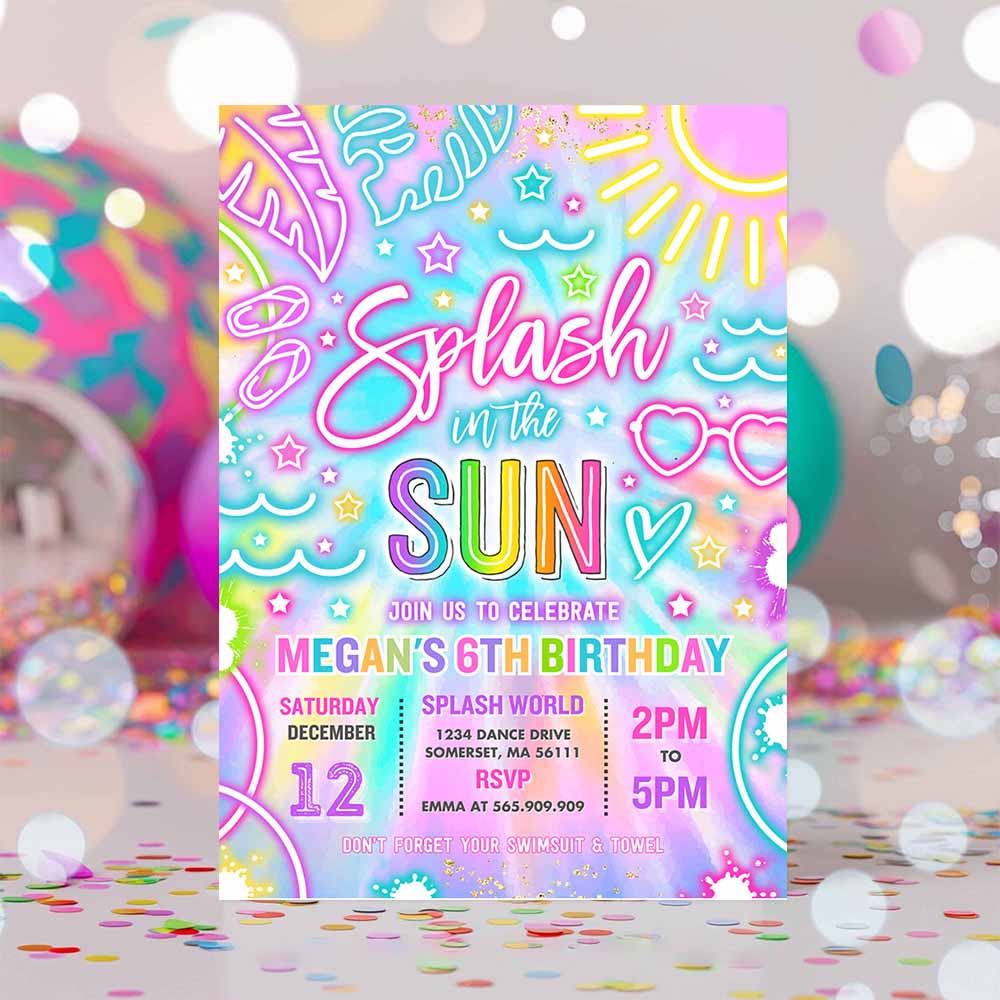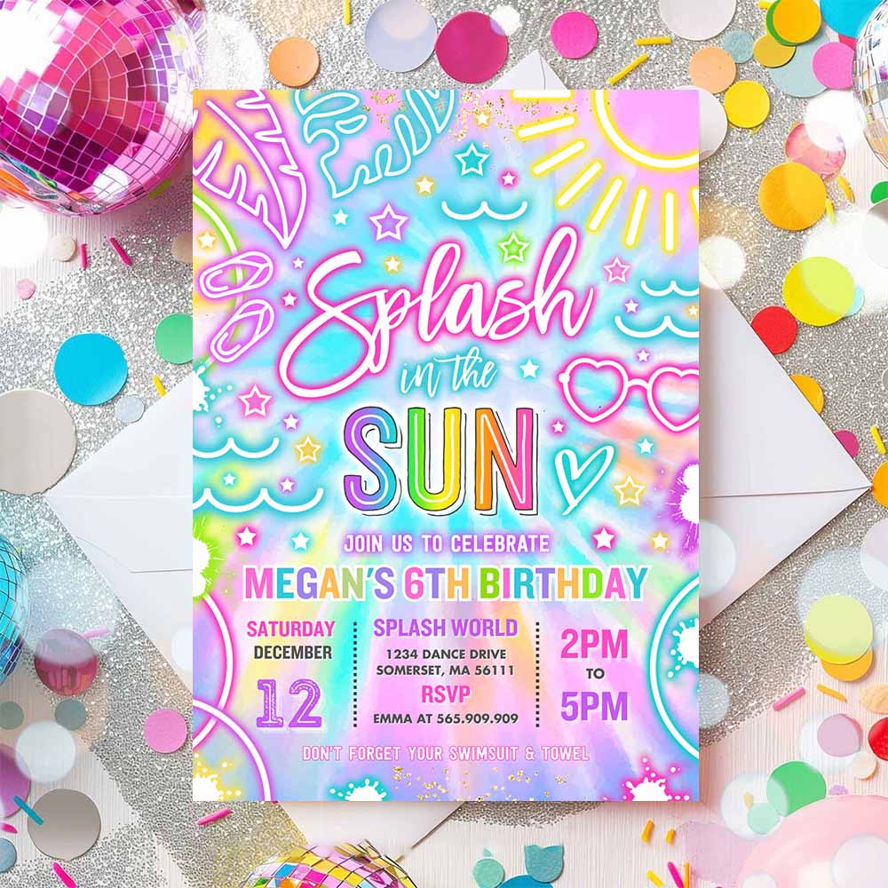 Splash In The Sun Pool Birthday Party Invitation Glow Neon Tie Dye Summer Waterslide Waterpark Pool Party