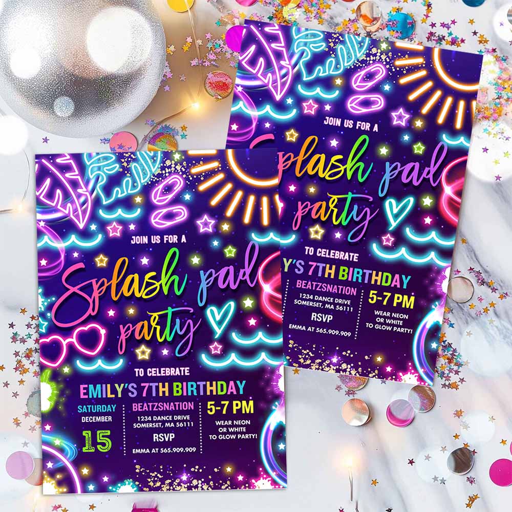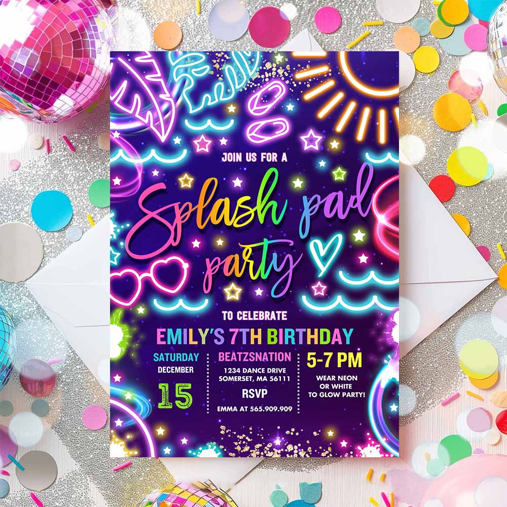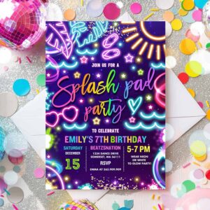 Splash Pad Birthday Party Invitation Glow Neon Splash Pad Summer Water Slide Splish Splash Pool Birthday Party