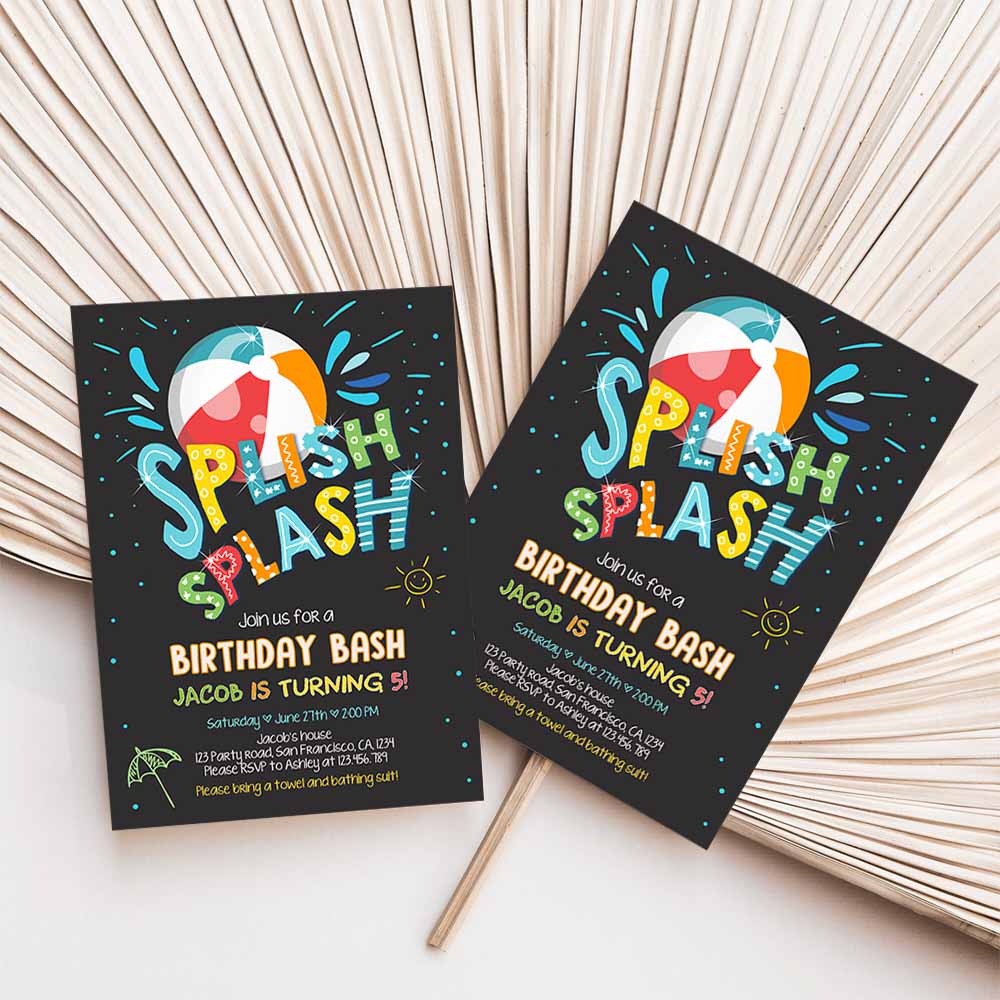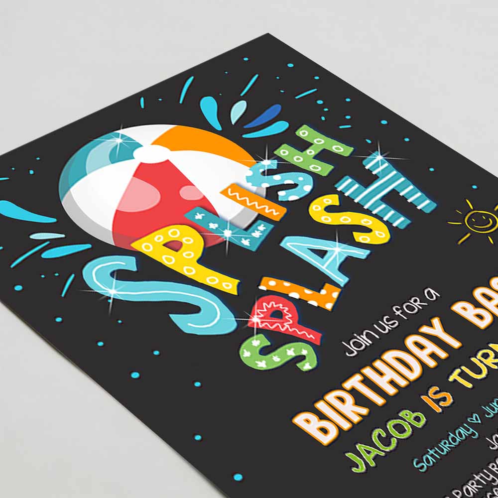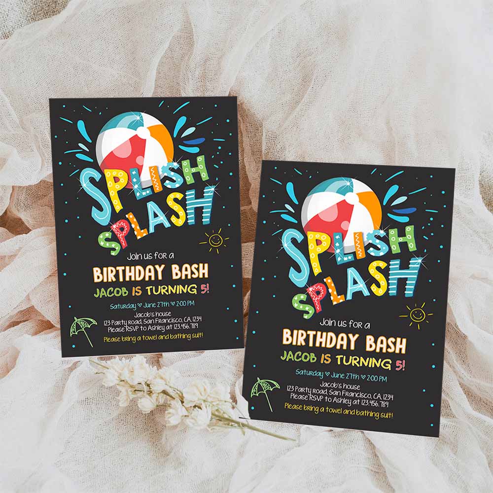 Splish Splash Birthday Invitation, Pool Black Party Boy Beach Ball Blue Birthday Bash