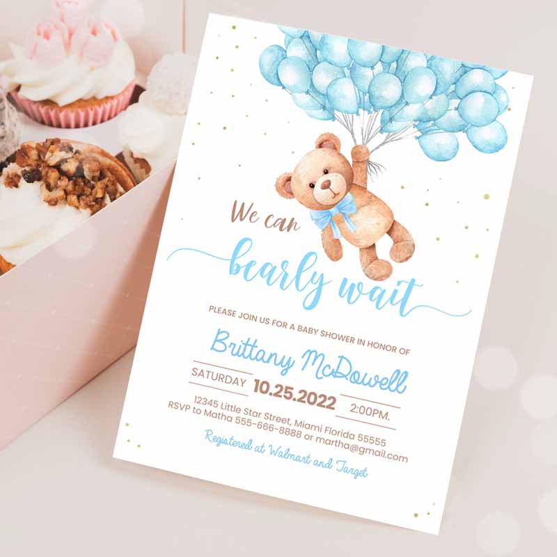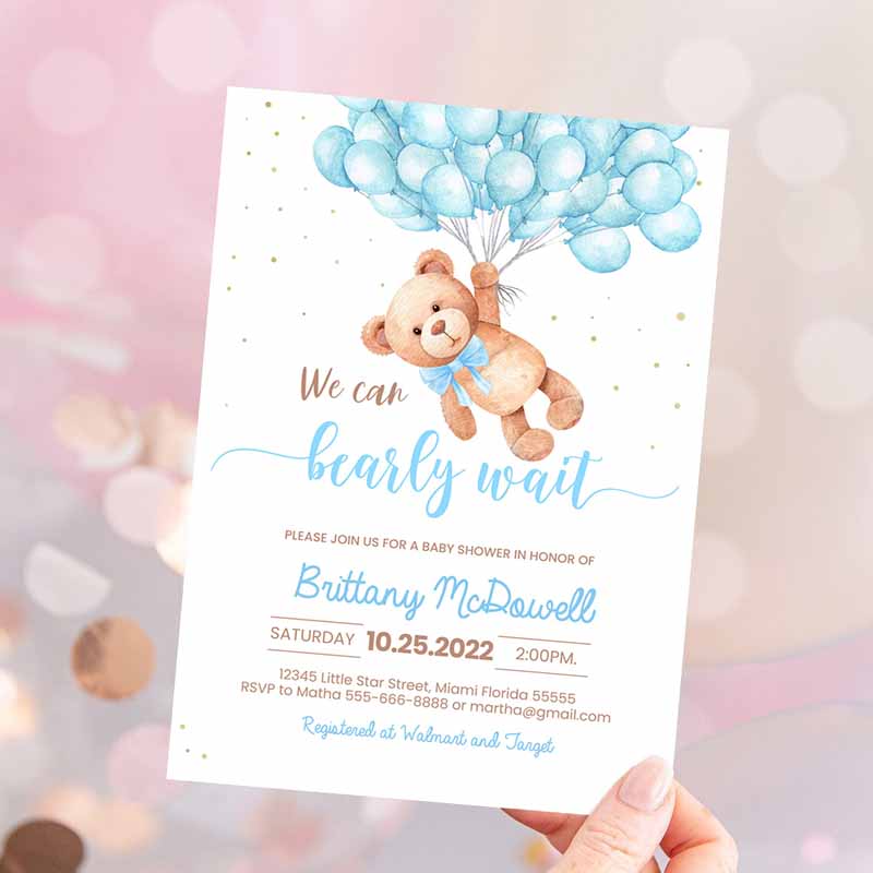 Teddy Bear Baby Shower Invitation, Bearemed Baby Shower Invite Bear With Balloons Invitations