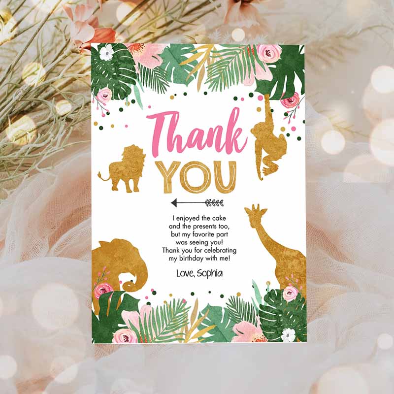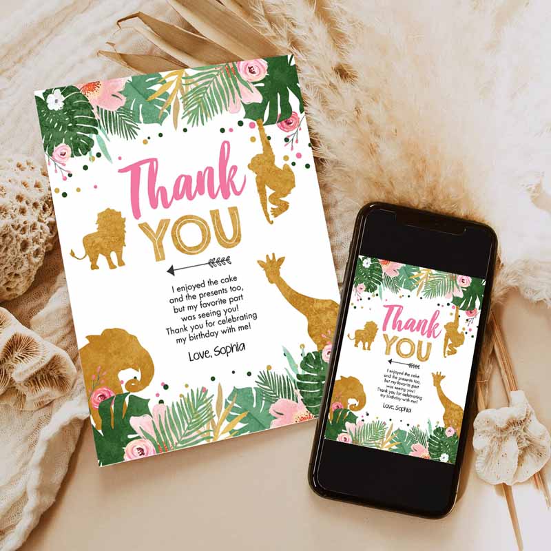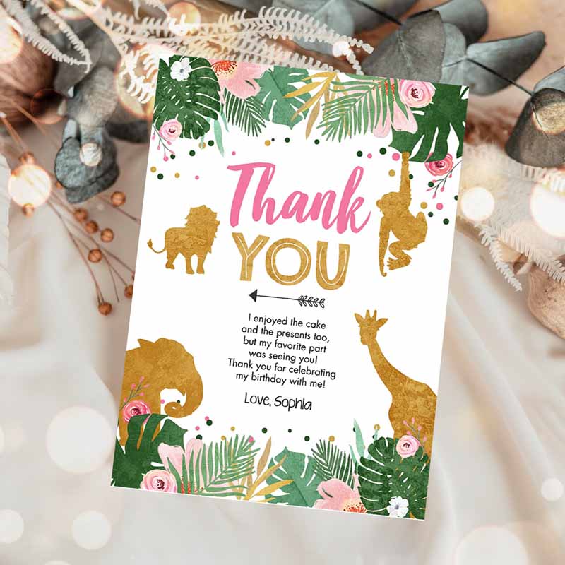 Thank You Card Safari Animals Wild One Thank You Note Black Photo Girl Pink Gold Jungle Zoo Animals