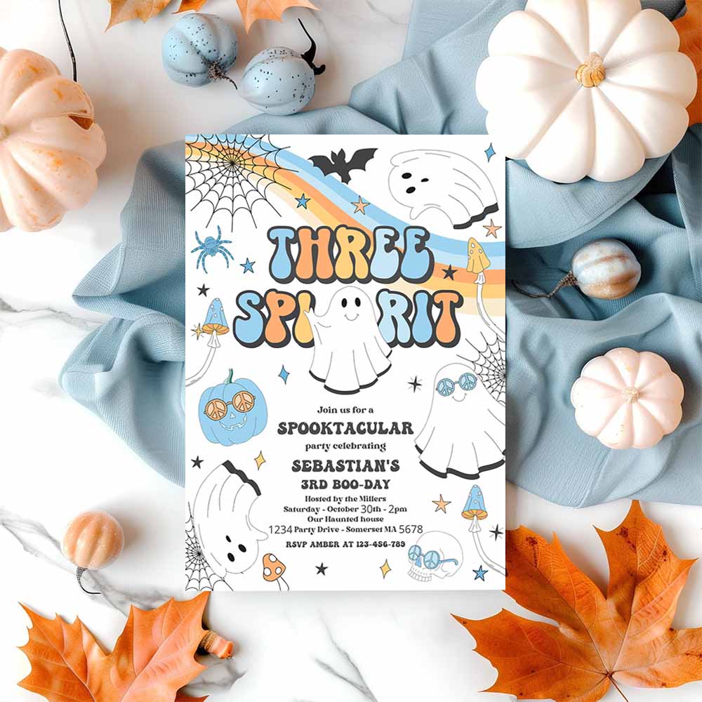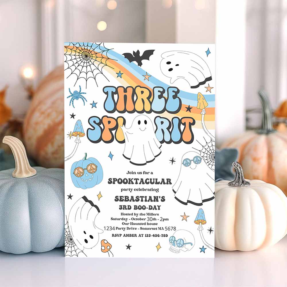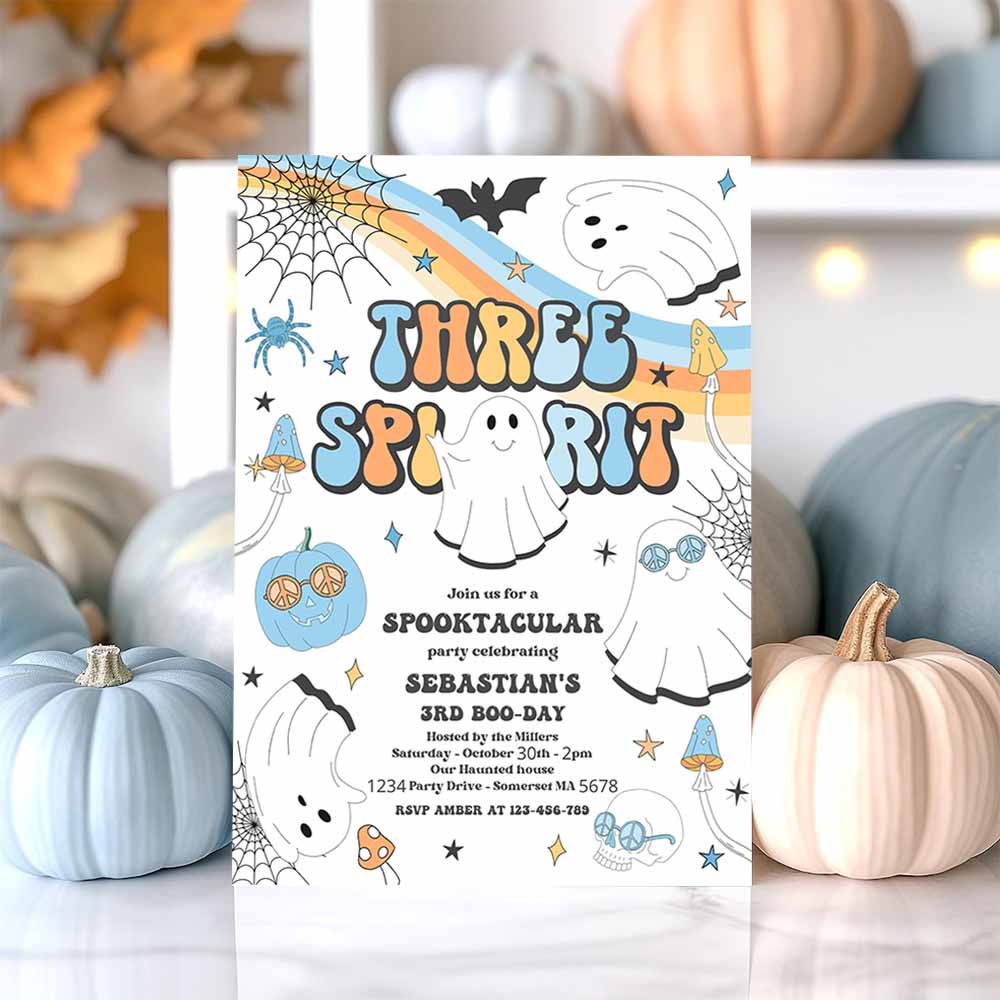 Three Spirit Halloween Ghost 3rd Birthday Invitation Retro Groovy Ghost Birthday Hippie Halloween Party