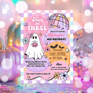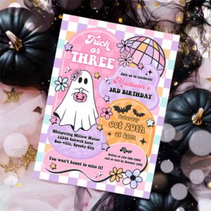 Trick Or Three Halloween Ghost 3rd Birthday Invitation Retro Groovy Rainbow Ghost Birthday Hippie Halloween