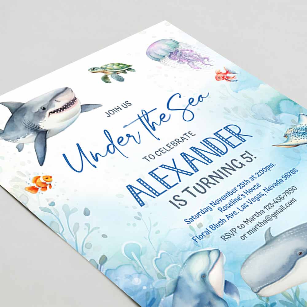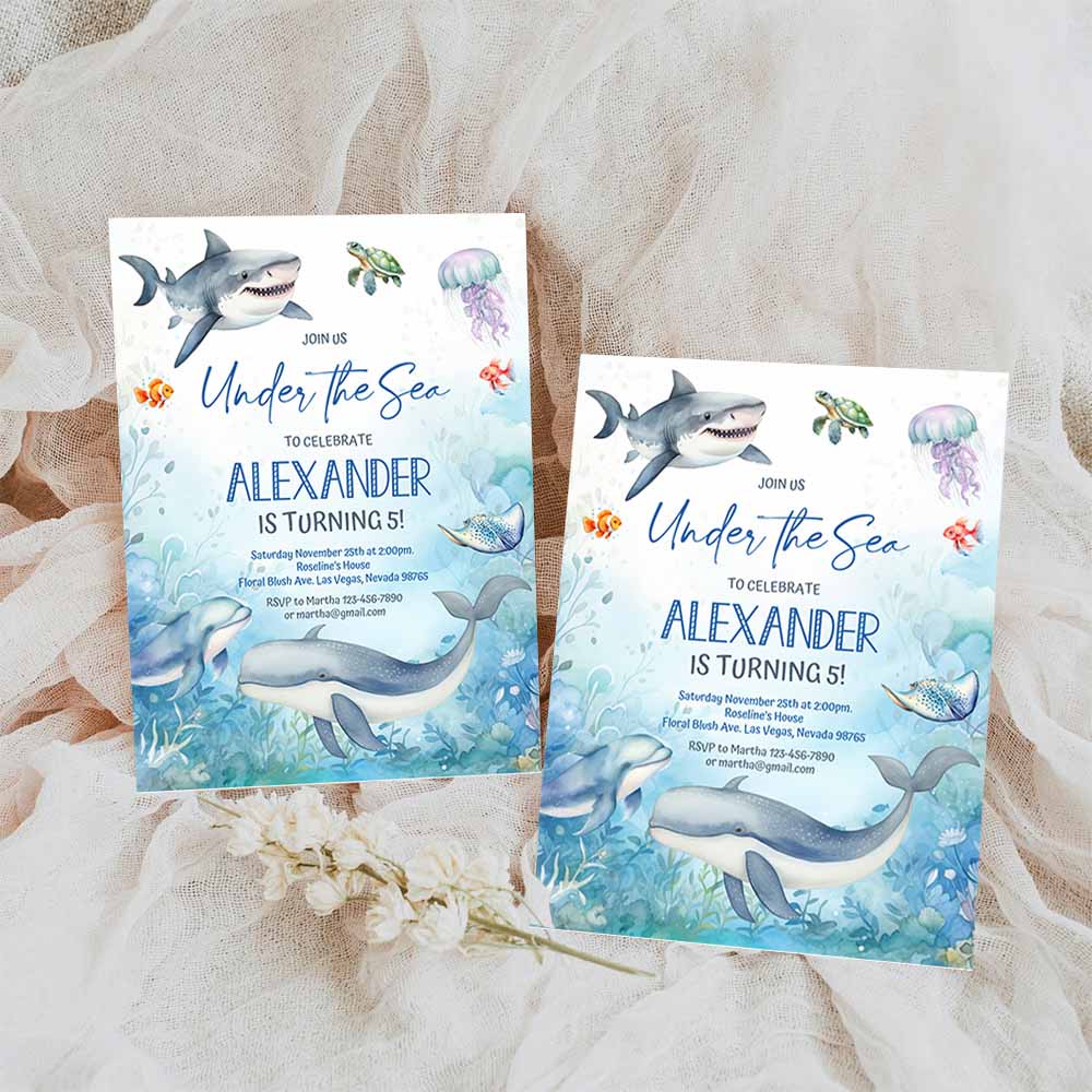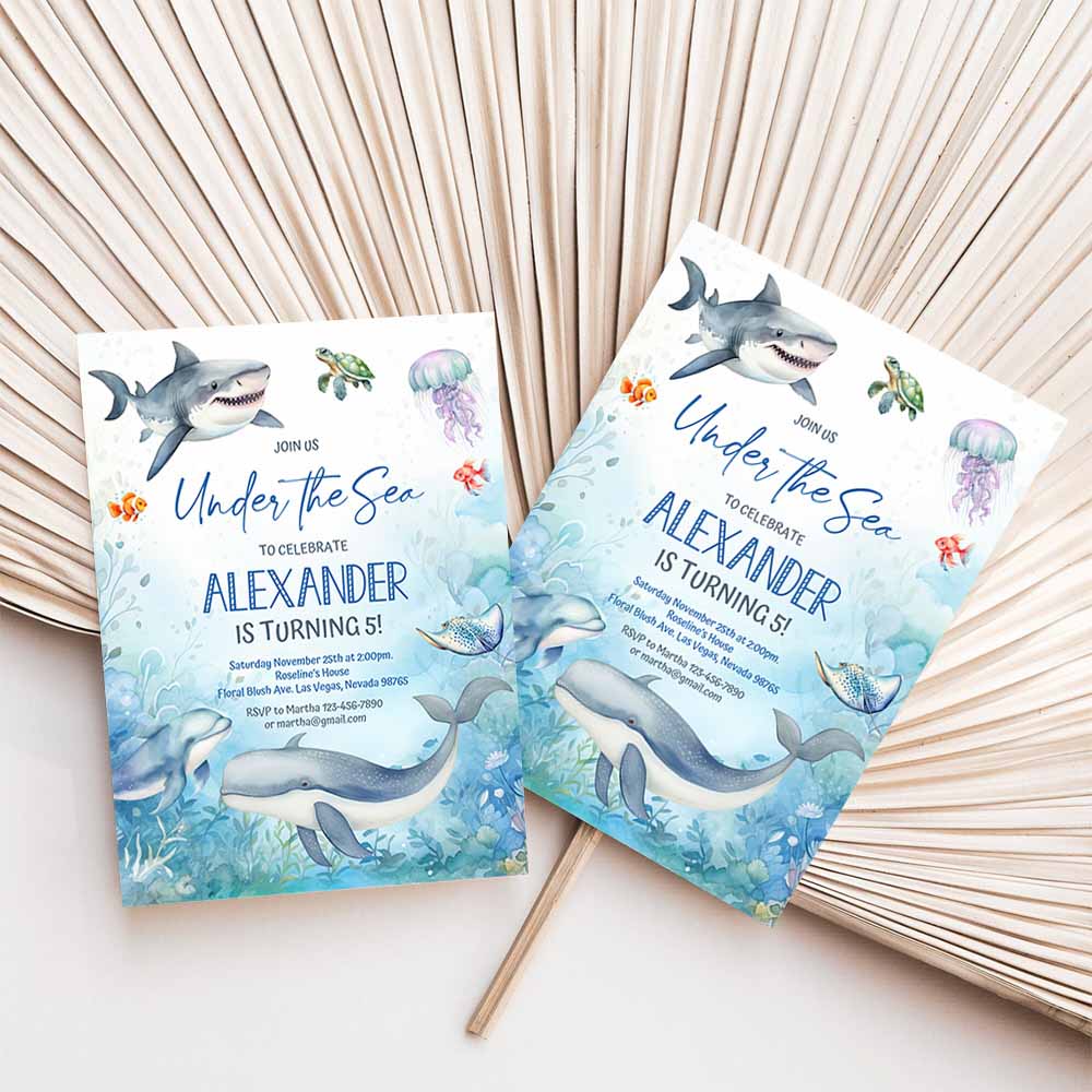 Under the sea Invitation, Oneder the sea birthday invite, Sea animals ocean theme Whale Shark Fish