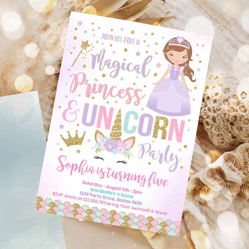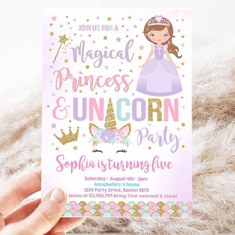 Unicorn And Princess Kids Birthday Invitation, Unicorn And Princess Magical Kids Birthday