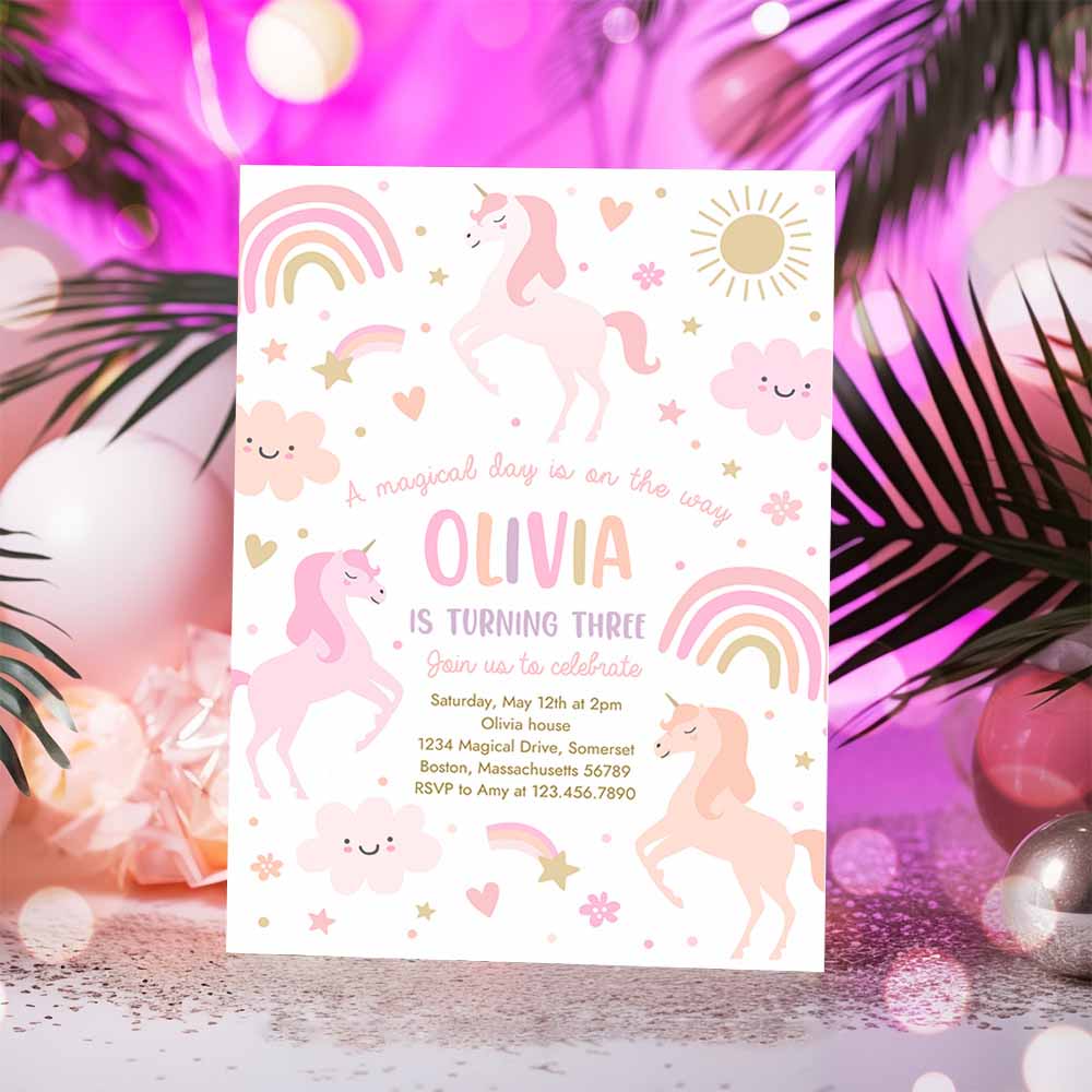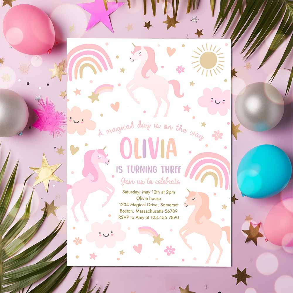 Unicorn Birthday Invitation, Magical Pink Pastel Rainbow Unicorn Party Whimsical Fairytale Unicorn Party