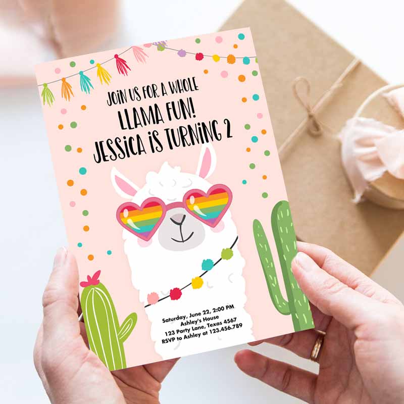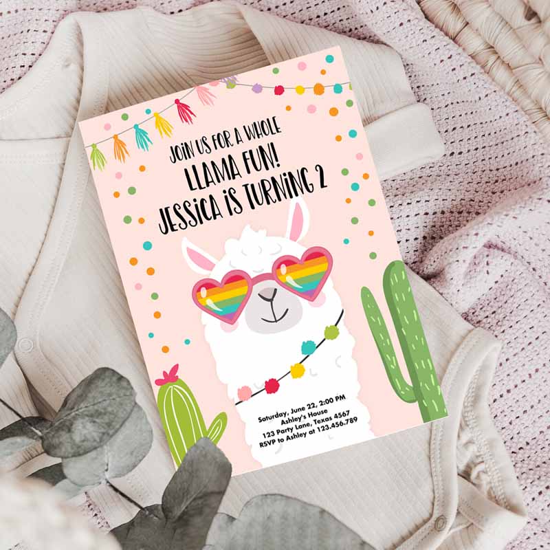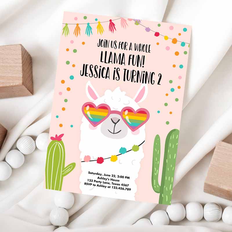 Whole Llama Fun Kids Birthday Invitation, Llama Fiesta Cactus Sunglasses Girl Pink Alpaca