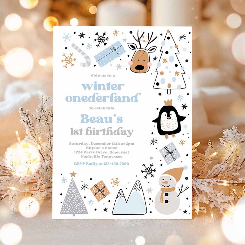 Winter Onederland Invitation Whimsical Winter Forest Mountains Animals Blue Silver Winter ONEderland Birthday