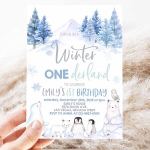 Winter Onederland Invitation, Wonderland First Kids Birthday Party, Boy Girl Polar Bear Arctic Animals Woodland Forest