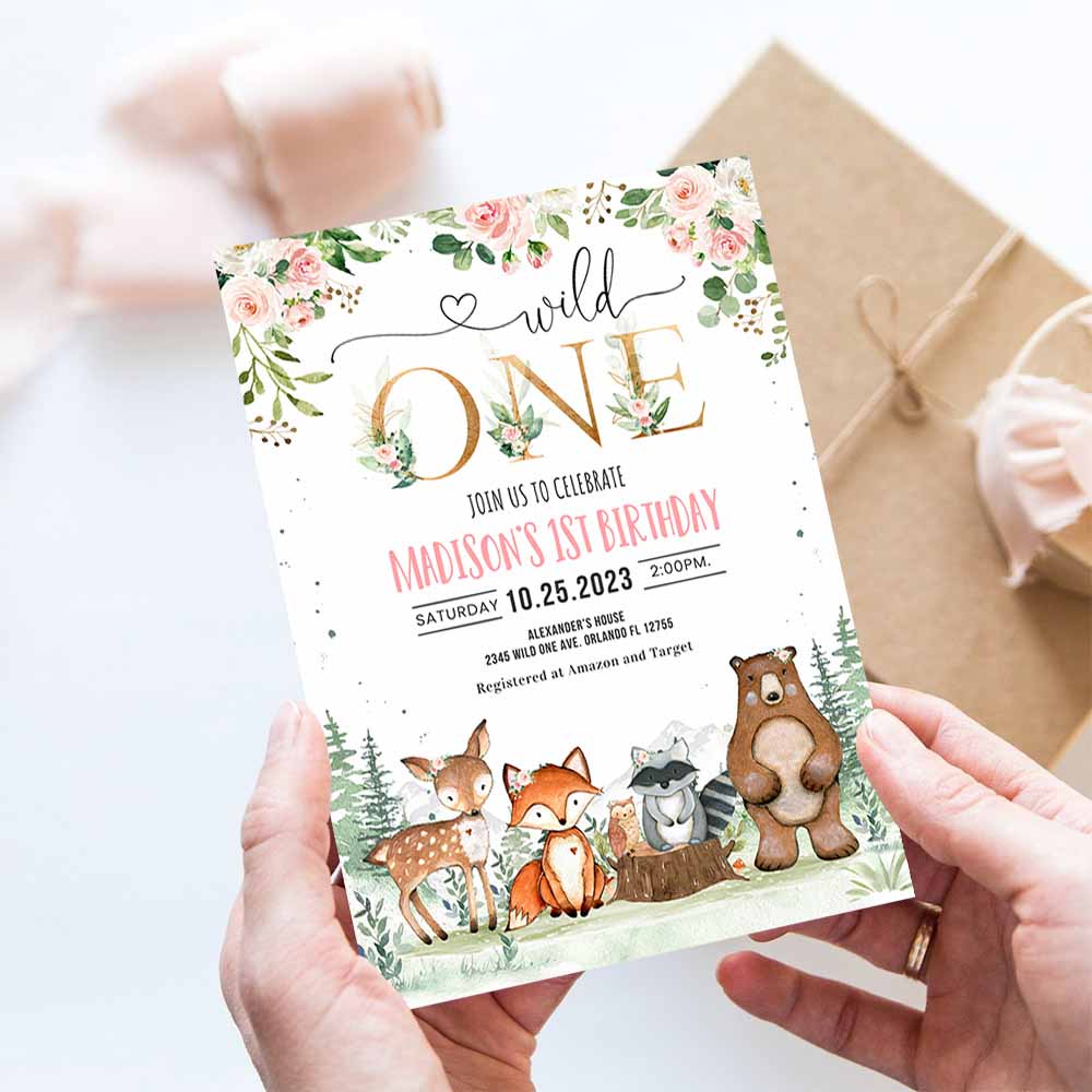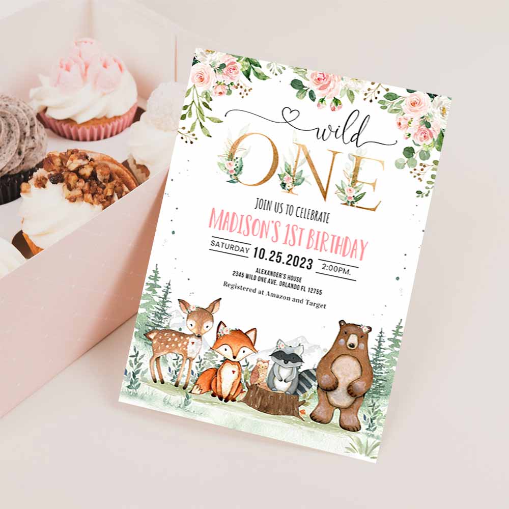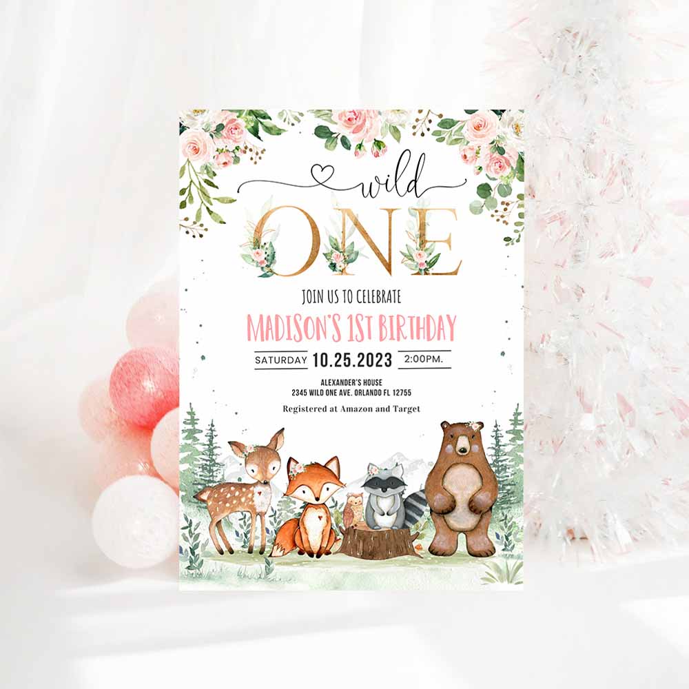 Woodland birthday invitation, Girl Woodland first birthday invitation, Wild One Woodland Creatures