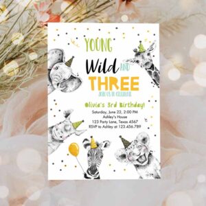 Young Wild and Three Kids Birthday Invitation, Boy Green Gold Third Safari Animals
