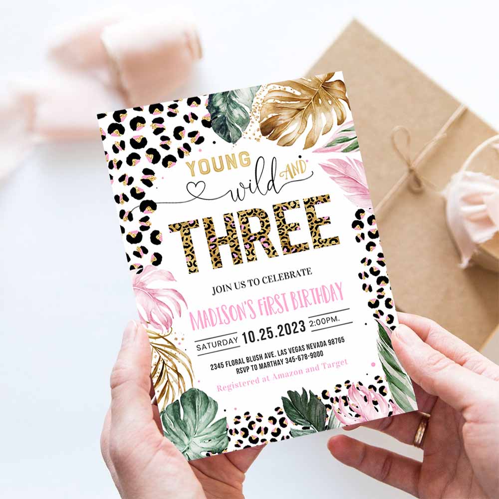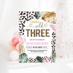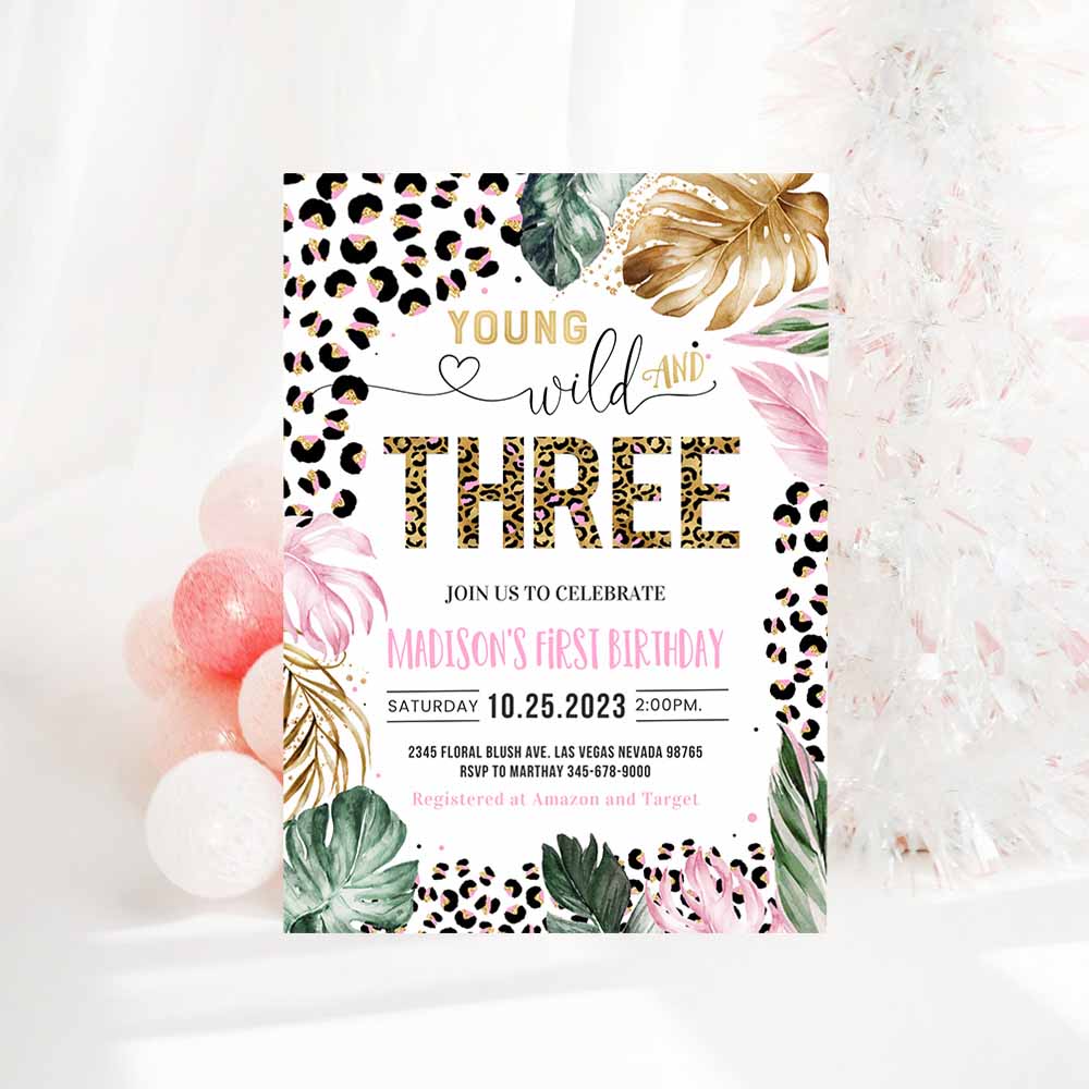 Young Wild And Three Leopard Print Jungle Birthday Party Invitation Leopard Print Wild And Three Birthday Party